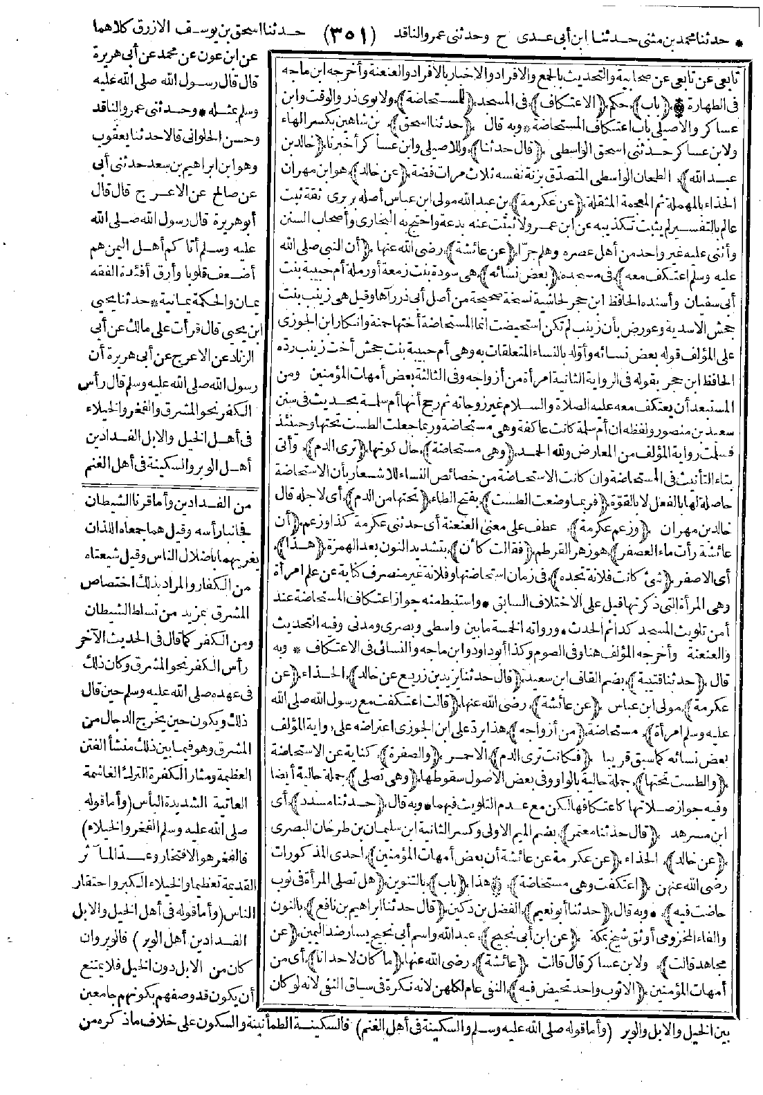 واستنبط منه جواز اعتكاف المستحاضة عند أمن تلويث المسجد كدائم الحدث. ورواته الخمسة ما بين واسطي وبصري ومدني وفيه التحديث والعنعنة، وأخرجه المؤلف هنا وفي الصوم وكذا أبو داود وابن ماجة والنسائي في الاعتكاف.
