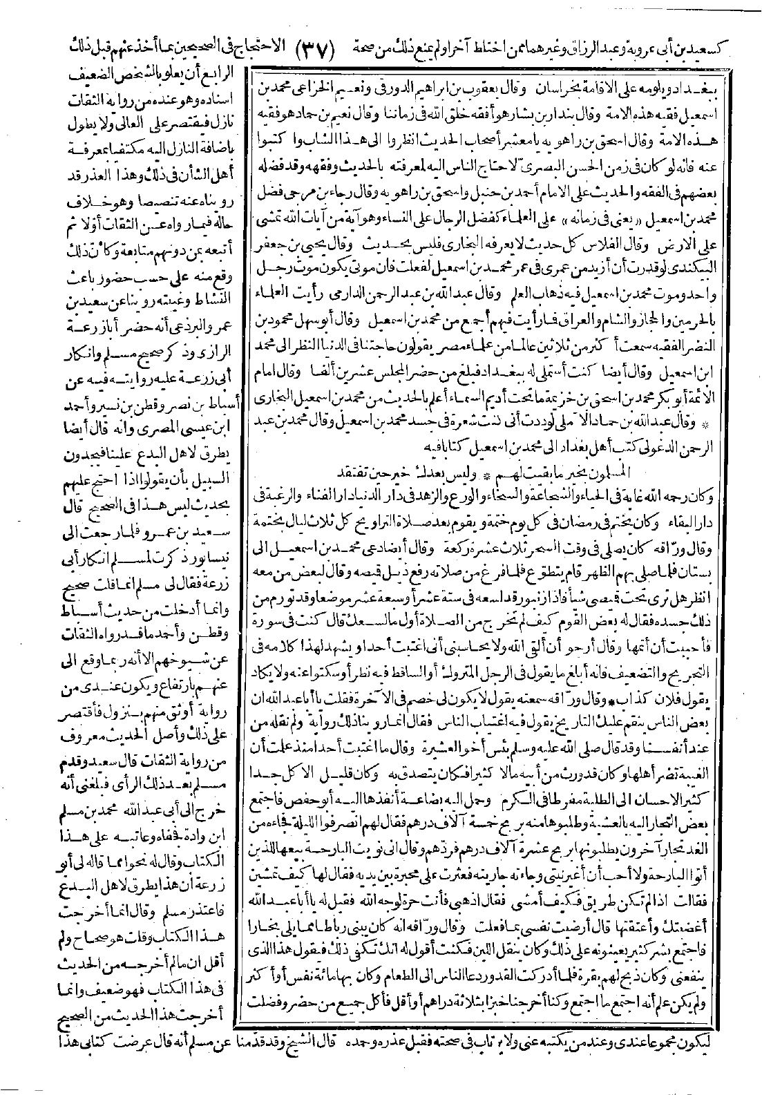 وكان رحمه الله غاية في الحياء والشجاعة والسخاء والورع والزهد في دار الدنيا دار الفناء والرغبة في دار البقاء، وكان يختم في رمضان في كل يوم ختمة ويقوم بعد صلاة التراويح كل ثلاث ليال بختمة، وقال ورّاقه: كان يصلي في وقت السحر ثلاث عشرة ركعة. وقال أيضًا دعي محمد بن إسماعيل إلى بستان فلما صلى بهم الظهر قام يتطوّع، فلما فرغ من صلاته رفع ذيل قميصه وقال لبعض من معه انظر هل ترى تحت قميصي شيئًا فإذا زنبور قد لسعه في ستة عشر أو سبعة عشر موضعًا وقد تورّم من ذلك جسده، فقال له بعض القوم كيف لم تخرج من الصلاة أوّل ما لسعك؟ قال: كنت في سورة فأحببت أن أتمّها، وقال أرجو أن ألقى الله ولا يحاسبني أني اغتبت أحدًا ويشهد لهذا كلامه في التجريح والتضعيف، فإنه أبلغ ما يقول في الرجل المتروك أو الساقط فيه نظر أو سكتوا عنه ولا يكاد يقول فلان كذاب. وقال ورّاقه سمعته يقول لا يكون لي خصم في الآخرة، فقلت يا أبا عبد الله إن بعض الناس ينقم عليك التاريخ يقول فيه اغتياب الناس، فقال إنما روينا ذلك رواية ولم نقله من عند أنفسنا. وقد قال -صَلَّى اللَّهُ عَلَيْهِ وَسَلَّمَ- بئس أخو العشيرة. وقال ما اغتبت أحدًا منذ علمت أن الغيبة تضر أهلها، وكان قد ورث من أبيه مالاً كثيرًا فكان يتصدق به. وكان قليل الأكل جدًا كثير الإحسان إلى الطلبة مفرطًا في الكرم. وحمل إليه بضاعة أنفذها إليه أبو حفص فجاءه من الغد تجار آخرون يطلبونها بربح عشرة آلاف درهم فردّهم وقال إني نويت البارحة بيعها للذين أتوا البارحة ولا أحب أن أغيّر نيّتي. وجاءته جاريته فعثرت على محبرة بين يديه فقال لها كيف تمشين؟ فقالت إذا لم تكن طريق فكيف أمشي. فقال اذهبي فأنت حرة لوجه الله، فقيل له يا أبا