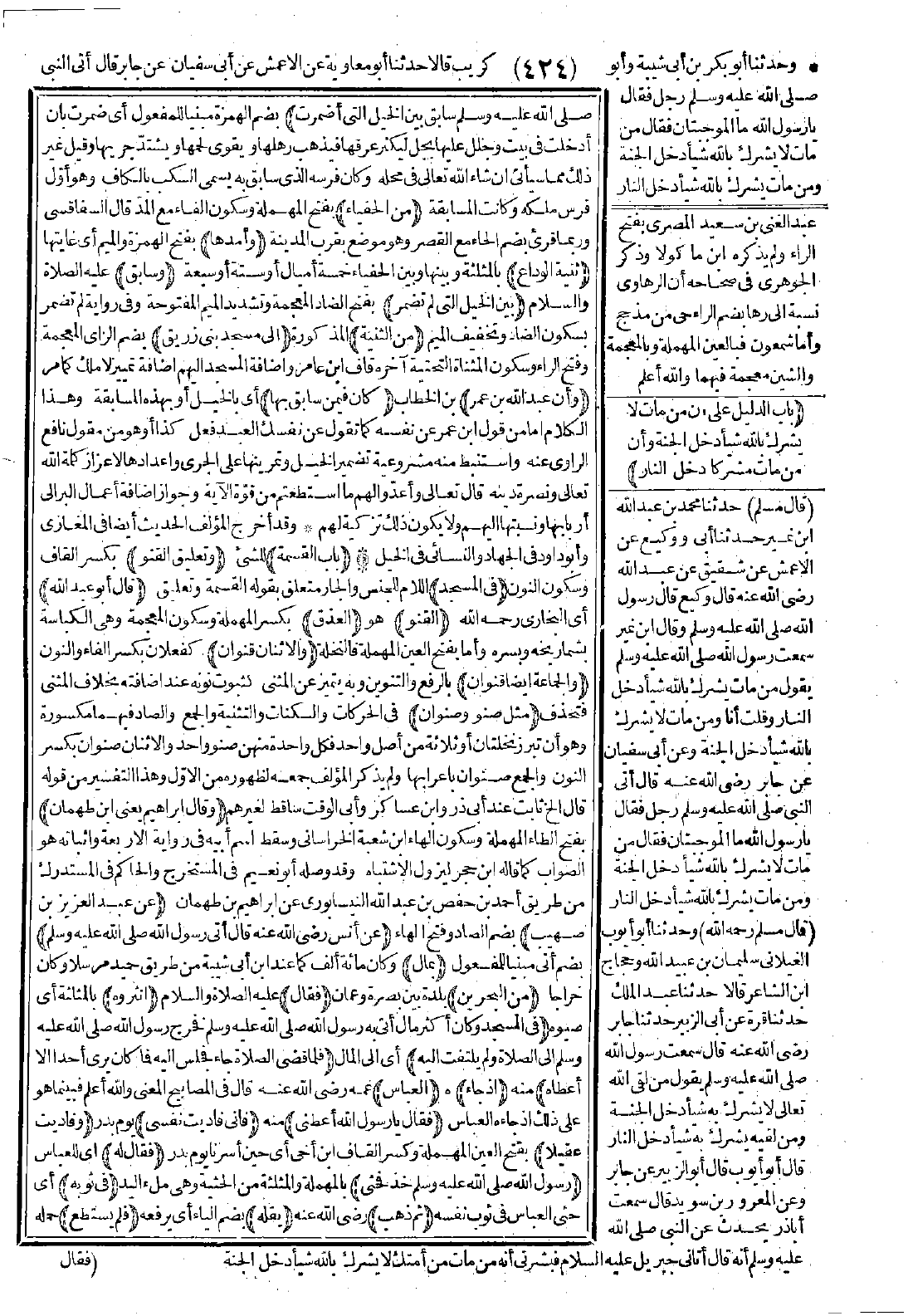 421 - وَقَالَ إِبْرَاهِيمُ عَنْ عَبْدِ الْعَزِيزِ بْنِ صُهَيْبٍ عَنْ أَنَسٍ -رضي الله عنه- قَالَ: أُتِيَ النَّبِيُّ -صَلَّى اللَّهُ عَلَيْهِ وَسَلَّمَ- بِمَالٍ مِنَ الْبَحْرَيْنِ فَقَالَ: انْثُرُوهُ فِي الْمَسْجِدِ. وَكَانَ أَكْثَرَ مَالٍ أُتِيَ بِهِ رَسُولُ اللَّهِ -صَلَّى اللَّهُ عَلَيْهِ وَسَلَّمَ-، فَخَرَجَ رَسُولُ اللَّهِ -صَلَّى اللَّهُ عَلَيْهِ وَسَلَّمَ- إِلَى الصَّلاَةِ وَلَمْ يَلْتَفِتْ إِلَيْهِ، فَلَمَّا قَضَى الصَّلاَةَ جَاءَ فَجَلَسَ إِلَيْهِ، فَمَا كَانَ يَرَى أَحَدًا إِلاَّ أَعْطَاهُ. إِذْ جَاءَهُ الْعَبَّاسُ فَقَالَ: يَا رَسُولَ اللَّهِ أَعْطِنِي، فَإِنِّي فَادَيْتُ نَفْسِي وَفَادَيْتُ عَقِيلاً. فَقَالَ لَهُ رَسُولُ اللَّهِ -صَلَّى اللَّهُ عَلَيْهِ وَسَلَّمَ-: خُذْ فَحَثَا فِي ثَوْبِهِ، ثُمَّ ذَهَبَ يُقِلُّهُ فَلَمْ يَسْتَطِعْ، فَقَالَ: يَا رَسُولَ اللَّهِ أُؤْمُرْ بَعْضَهُمْ يَرْفَعُهُ إِلَىَّ. قَالَ: لاَ. قَالَ: فَارْفَعْهُ أَنْتَ عَلَىَّ. قَالَ: لاَ. فَنَثَرَ مِنْهُ، ثُمَّ ذَهَبَ يُقِلُّهُ فَقَالَ: يَا رَسُولَ اللَّهِ أُؤْمُرْ بَعْضَهُمْ يَرْفَعْهُ عَلَىَّ. قَالَ: لاَ. قَالَ: فَارْفَعْهُ أَنْتَ عَلَىَّ. قَالَ: «لاَ». فَنَثَرَ مِنْهُ. ثُمَّ احْتَمَلَهُ فَأَلْقَاهُ عَلَى كَاهِلِهِ، ثُمَّ انْطَلَقَ، فَمَا زَالَ رَسُولُ اللَّهِ -صَلَّى اللَّهُ عَلَيْهِ وَسَلَّمَ- يُتْبِعُهُ بَصَرَهُ -حَتَّى خَفِيَ عَلَيْنَا- عَجَبًا مِنْ حِرْصِهِ. فَمَا قَامَ رَسُولُ اللَّهِ -صَلَّى اللَّهُ عَلَيْهِ وَسَلَّمَ- وَثَمَّ مِنْهَا دِرْهَمٌ. [الحديث 421 - طرفاه في: 3049، 3165].
