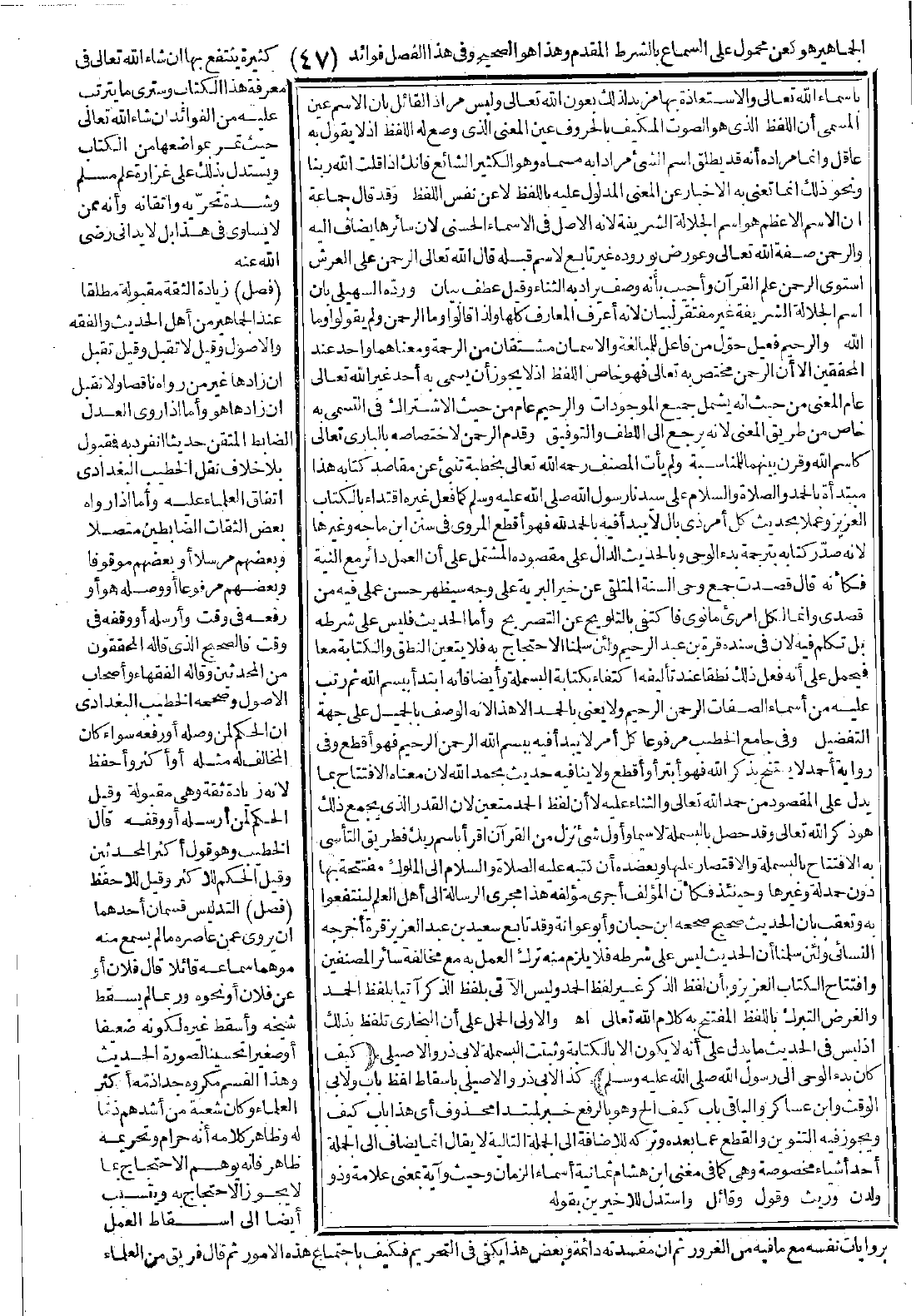 وقدّم الرحمن لاختصاصه بالباري تعالى كاسم الله وقرن بينهما للمناسبة، ولم يأتِ المصنف رحمه الله تعالى بخطبة تنبىء عن مقاصد كتابه هذا مبتدأة بالحمد والصلاة والسلام على سيدنا رسول الله -صَلَّى اللَّهُ عَلَيْهِ وَسَلَّمَ- كما فعل غيره اقتداء بالكتاب العزيز، وعملاً بحديث "كل أمر ذي بال لا يبدأ فيه بالحمد لله فهو أقطع" المروي في سنن ابن ماجة وغيرها لأنه صدّر كتابه بترجمة بدء الوحي، وبالحديث الدال على مقصوده المشتمل على أن العمل دائر مع النية، فكأنه قال قصدت جمع وحي السنة المتلقى عن خير البرية على وجه سيظهر حسن عملي فيه من قصدي، وإنما لكل امرىء ما نوى. فاكتفى بالتلويح عن التصريح. وأما الحديث فليس على شرطه بل تكلم فيه لأن في سنده قرة بن عبد الرحيم، ولئن سلمنا الاحتجاج به فلا يتعين النطق والكتابة معًا فيحمل على أنه فعل ذلك نطقًا عند تأليفه اكتفاء بكتابة البسملة، وأيضًا فإنه ابتدأ ببسم الله ثم رتب عليه من أسماء الصفات الرحمن الرحيم، ولا يعني بالحمد إلا هذا لأنه الوصف بالجميل على جهة التفضيل، وفي جامع الخطيب مرفوعًا "كل أمر لا يبدأ فيه ببسم الله الرحمن الرحيم فهو أقطع" وفي رواية أحمد لا يفتتح بذكر الله فهو أبتر أو أقطع ولا ينافيه حديث بحمد الله لأن معناه الافتتاح بما يدل على المقصود من حمد الله تعالى والثناء عليه، لا أن لفظ الحمد متعين لأن القدر الذي يجمع ذلك هو ذكر الله تعالى، وقد حصل بالبسملة لا سيما وأول شيء نزل من القرآن اقرأ باسم ربك، فطريق التأسي به الافتتاح بالبسملة والاقتصار عليها، ويعضده أن كتبه عليه الصلاة والسلام إلى الملوك مفتتحة بها دون حمدلة وغيرها، وحينئذ فكأن المؤلف أجرى مؤلفه هذا مجرى الرسالة إلى أهل العلم لينتفعوا به.