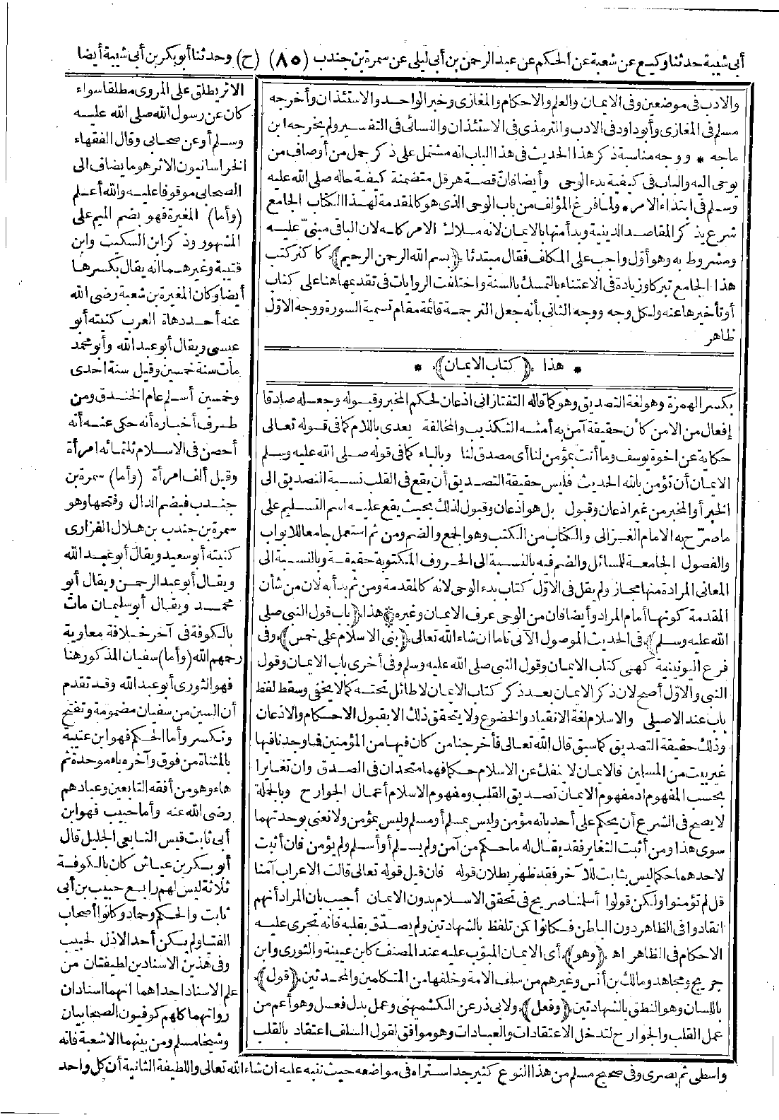 ولما فرغ المؤلف من باب الوحي الذي هو كالمقدمة لهذا الكتاب الجامع شرع يذكر المقاصد الدينية وبدأ منها بالإيمان لأنه ملاك الأمر كله، لأن الباقي مبنيّ عليه ومشروط به وهو أوّل واجب على المكلف فقال مبتدئًا: (بسم الله الرحمن الرحيم) كأكثر كتب هذا الجامع تبركًا وزيادة في الاعتناء بالتمسك بالسُّنَّة، واختلفت الروايات في تقديمها هنا على كتاب أو تأخيرها عنه، ولكلٍّ وجه ووجه الثاني بأنه جعل الترجمة قائمة مقام تسمية السورة ووجه الأوّل ظاهر.