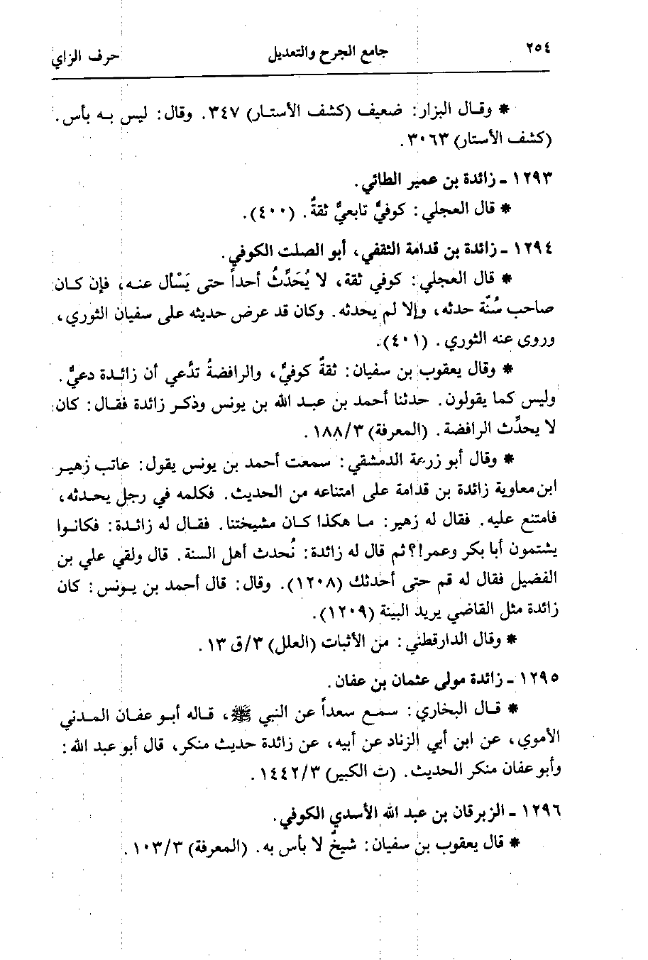 * وقال أبو زرعة الدمشقي: سمعت أحمد بن يونس يقول: عاتب زهير بن معاوية زائدة بن قدامة على امتناعه من الحديث. فكلمه في رجل يحدثه، فامتنع عليه. فقال له زهر: ما هكذا كان مشيختنا. فقال له زائدة: فكانوا يشتمون أبا بكر وعمر! ؟ ثم قال له زائدة: نُحدث أهل السنة. قال ولقي علي بن الفضيل فقال له قم حتى أحدثك (1208). وقال: قال أحمد بن يونس: كان زائدة مثل القاضي يريد البينة (1209).