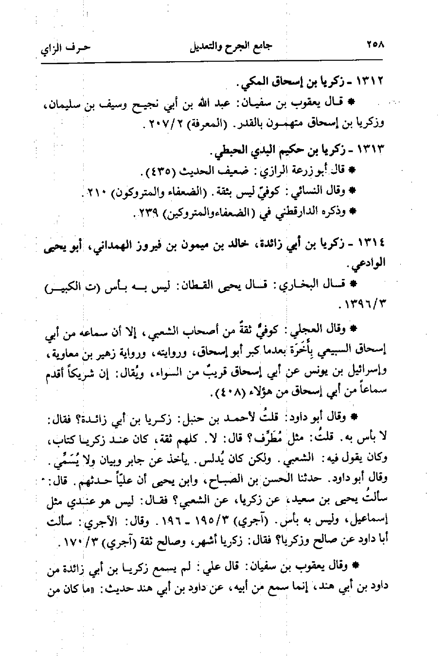 * وقال أبو داود: قلتُ لأحمد بن حنبل: زكريا بن أبي زائدة؟ فقال: لا بأس به. قلتُ: مثل مُطَرِّف؟ قال: لا. كلهم ثقة، كان عند زكريا كتاب، وكان يقول فيه: الشعبي. ولكن كان يُدلس. يأخذ عن جابر وبيان ولا يُسَمِّي. وقال أبو داود. حدثنا الحسن بن الصباح، وابن يحيى أن عليًّا حدثهم. قال: سألتُ يحيى بن سعيد، عن زكريا، عن الشعبي؟ فقال: ليس هو عندي مثل إسماعيل، وليس به بأس. (آجري) 3/ 195 - 196. وقال: الآجري: سألت أبا داود عن صالح وزكريا؟ فقال: زكريا أشهر، وصالح ثقة (آجري) 3/ 170.