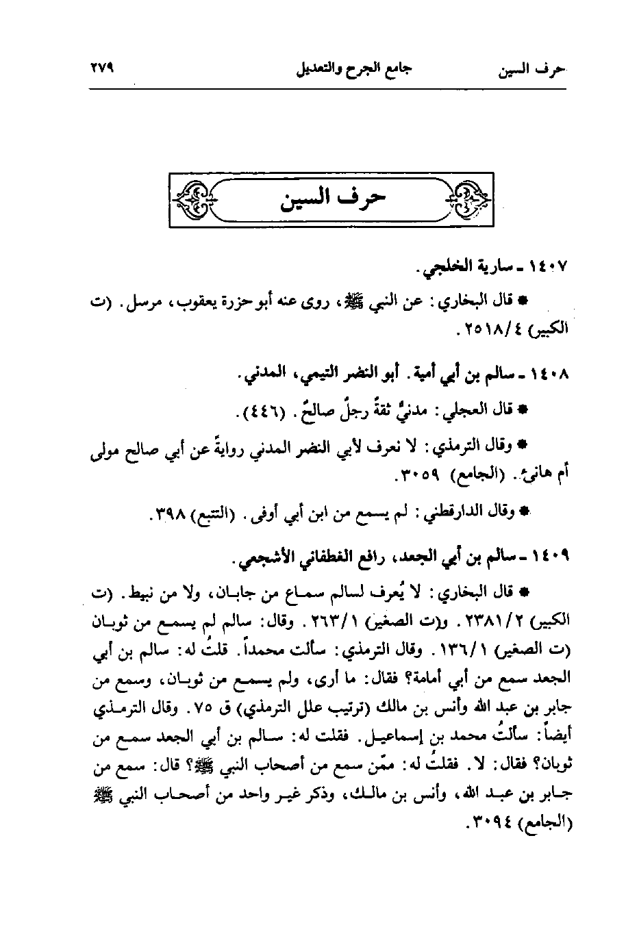 * قال البخاري: لا يُعرف لسالم سماع من جابان، ولا من نبيط. (ت الكبير) 2/ 2381. و (ت الصغير) 1/ 263. وقال: سالم لم يسمع من ثوبان (ت الصغير) 1/ 136. وقال الترمذي: سألت محمدًا. قلتُ له: سالم بن أبي الجعد سمع من أبي أمامة؟ فقال: ما أرى، ولم يسمع من ثوبان، وسمع من جابر بن عبد الله وأنس بن مالك (ترتيب علل الترمذي) ق 75. وقال الترمذي أيضًا: سألتُ محمد بن إسماعيل. فقلت له: سالم بن أبي الجعد سمع من ثوبان؟ فقال: لا. فقلتُ له: ممّن سمع من أصحاب النبي - صلى الله عليه وسلم -؟ قال: سمع من جابر بن عبد الله، وأنس بن مالك، وذكر غير واحد من أصحاب النبي - صلى الله عليه وسلم - (الجامع) 3094.
