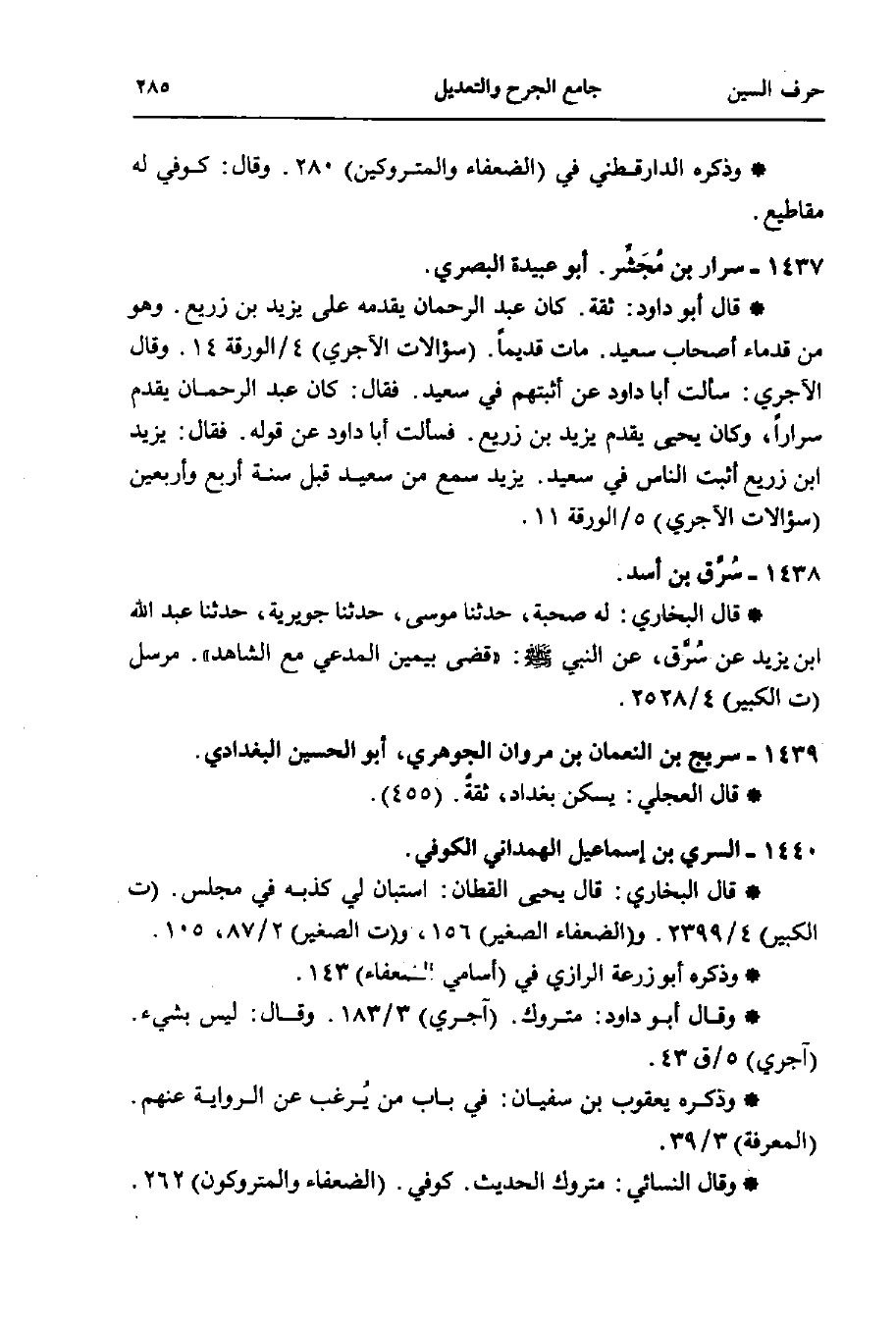 * قال أبو داود: ثقة. كان عبد الرحمن يقدمه على يزيد بن زريع. وهو من قدماء أصحاب سعيد. مات قديمًا. (سؤالات الآجري) 4/ الورقة 14. وقال الآجري: سألت أبا داود عن أثبتهم في سعيد. فقال: كان عبد الرحمن يقدم سرارًا، وكان يحيى يقدم يزيد بن زريع. قالت أبا داود عن قوله. فقال: يزيد بن زريع أثبت الناس في سعيد. يزيد سمع من سعيد قبل سنة أربع وأربعين (سؤالات الآجري) 5/ الورقة 11.