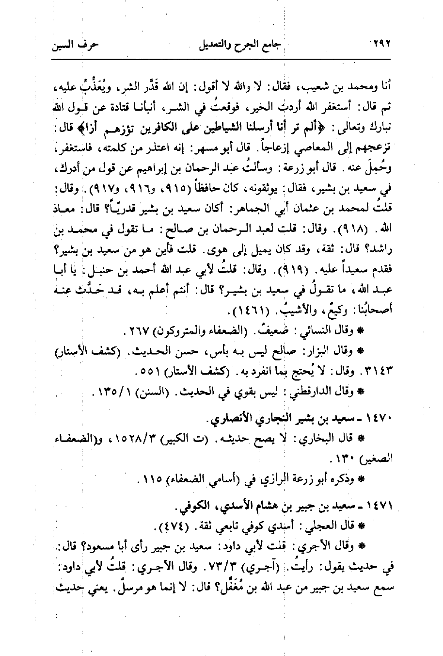 أنا ومحمد بن شعيب، فقال: لا والله لا أقول: إن الله قَدَّر الشر، ويُعَذِّبُ عليه، ثمَّ قال: أستغفر الله أردت الخير، فوقعتُ في الشر، أنبأنا قتادة عن قول الله تبارك وتعالى: {أَلَمْ تَرَ أَنَّا أَرْسَلْنَا الشَّيَاطِينَ عَلَى الْكَافِرِينَ تَؤُزُّهُمْ أَزًّا} قال: تزعجهم إلى المعاصي إزعاجًا. قال أبو مسهر: إنه اعتذر من كلمته، فاستغفر، وحُمِلَ عنه. قال أبو زرعة: وسألتُ عبد الرحمن بن إبراهيم عن قول من أدرك، في سعيد بن بشير، فقال: يوثقونه، كان حافظًا (915، و 916، و 917). وقال: قلتُ لمحمد بن عثمان أبي الجماهر: أكان سعيد بن بشير قدريًّا؟ قال: معاذ الله. (918). وقال: قلت لعبد الرحمن بن صالح: ما تقول في محمَّد بن راشد؟ قال: ثقة، وقد كان يميل إلى هوى. قلت فأين هو من سعيد بن بشير؟ فقدم سعيدًا عليه. (919). وقال: قلتُ لأبي عبد الله أحمد بن حنبل: يا أبا عبد الله، ما تقولُ في سعيد بن بشير؟ قال: أنتم أعلم به، قد حَدَّث عنه أصحابُنا: وكيعٌ، والأشيبُ. (1461).
