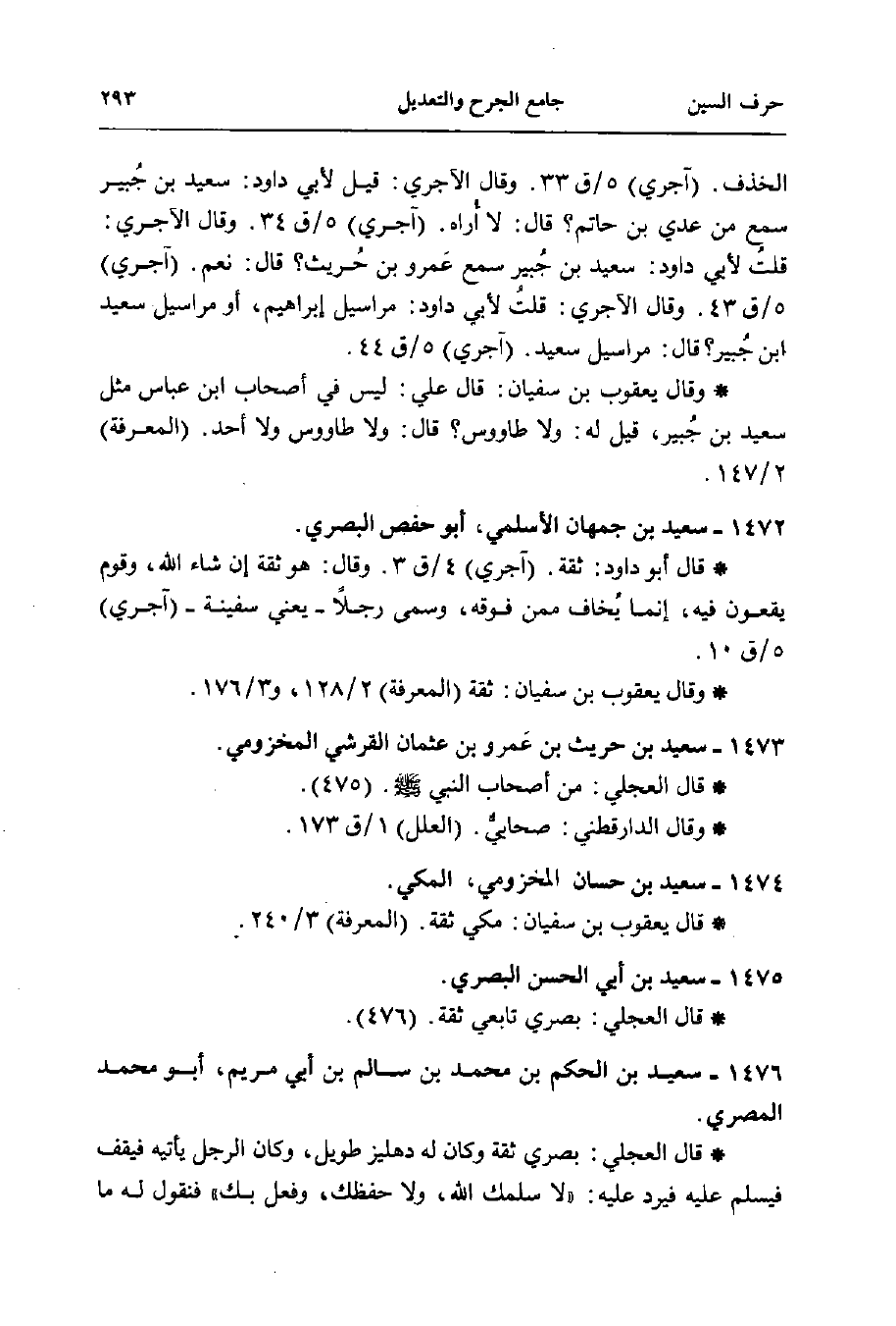 الخذف. (آجري) 5/ ق 33. وقال الآجري: قيل لأبي داود: سعيد بن جُبير سمع من عديّ بن حاتم؟ قال: لا أُراه. (آجري) 5/ ق 34. وقال الآجري: قلتُ لأبي داود: سعيد بن جُبير سمع عَمرو بن حُريث؟ قال: نعم. (آجري) 5/ ق 43. وقال الآجري: قلتُ لأبي داود: مراسيل إبراهيم، أو مراسيل سعيد بن جُبير؟ قال: مراسيل سعيد. (آجري) 5/ ق 44.