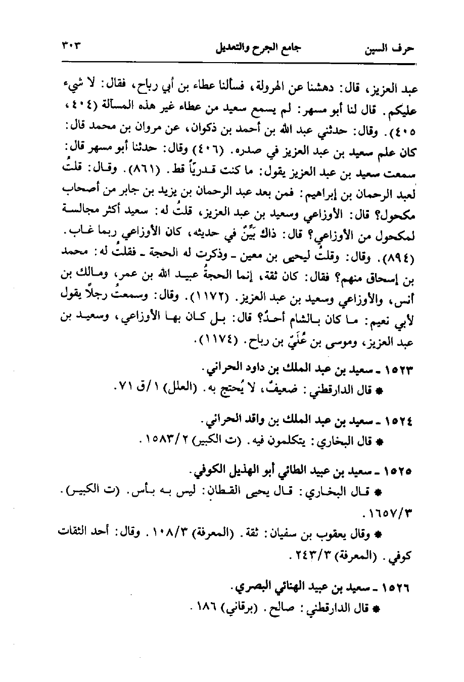 عبد العزيز، قال: دهشنا عن الهرولة، فسألنا عطاء بن أبي رباح، فقال: لا شيء عليكم. قال لنا أبو مسهر: لم يسمع سعيد من عطاء غير هذه المسألة (404، 405). وقال: حدثني عبد الله بن أحمد بن ذكوان، عن مروان بن محمد قال: كان علم سعيد بن عبد العزيز في صدره. (406) وقال: حدثنا أبو مسهر قال: سمعت سعيد بن عبد العزيز يقول: ما كنت قدريًا قط. (861). وقال: قلتُ لعبد الرحمن بن إبراهيم: فمن بعد عبد الرحمن بن يزيد بن جابر من أصحاب مكحول؟ قال: الأوزاعي وسعيد بن عبد العزيز، قلت له: سعيد أكثر مجالسة لمكحول من الأوزاعي؟ قال: ذاك بَيِّنٌ في حديثه، كان الأوزاعي ربما غاب. (894). وقال: وقلت ليحيى بن معين -وذكرت له الحجة- فقلتُ له: محمد بن إسحاق منهم؟ فقال: كان ثقة، إنما الحجة عبيد الله بن عمر، ومالك بن أنس، والأوزاعي وسعيد بن عبد العزيز. (1172). وقال: وسمعتُ رجلًا يقول لأبي نعيم: ما كان بالشام أحدٌ؟ قال: بل كان بها الأوزاعي، وسعيد بن عبد العزيز، وموسي بن عُليّ بن رباح. (1174).