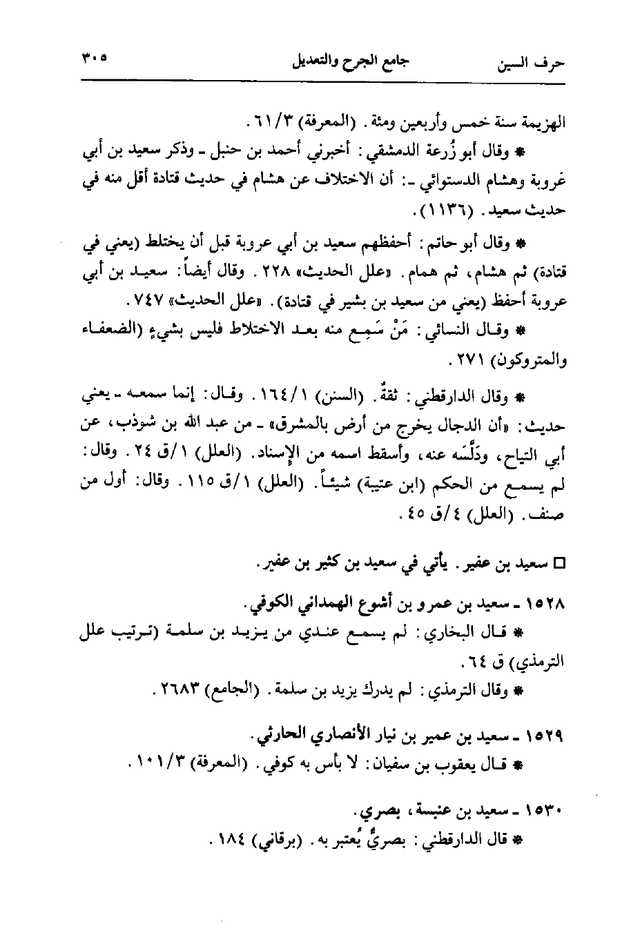 * وقال أبو حاتم: أحفظهم سعيد بن أبي عروبة قبل أن يختلط (يعني في قتادة) ثم هشام، ثم همام. "علل الحديث" 228. وقال أيضًا: سعيد بن أبي عروبة أحفظ (يعني من سعيد بن بشير في قتادة)."علل الحديث" 747.