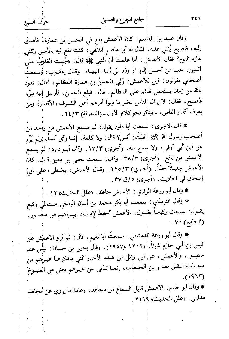 * قال الآجري: سمعت أبا داود يقول: لم يسمع الأعمش من واحد من أصحاب رسول الله - صلى الله عليه وسلم -. قلتُ: أنس؟ قال: ولا كلمة، إنما رأى أنسًا، ولم يَرْوِ عن ابن أبي أوفى، ولا سمع منه. (آجري) 3/ 17. وقال أبو داود: لم يسمع الأعمش من نافع. (آجري) 3/ 38. وقال: سمعت يحيى بن معين قال: كان الأعمش جليلًا جدًّا. (آجري) 3/ 225. وقال الأعمش: يخطئ على أبي إسحاق في أحاديث. (آجري) 5/ ق 37.