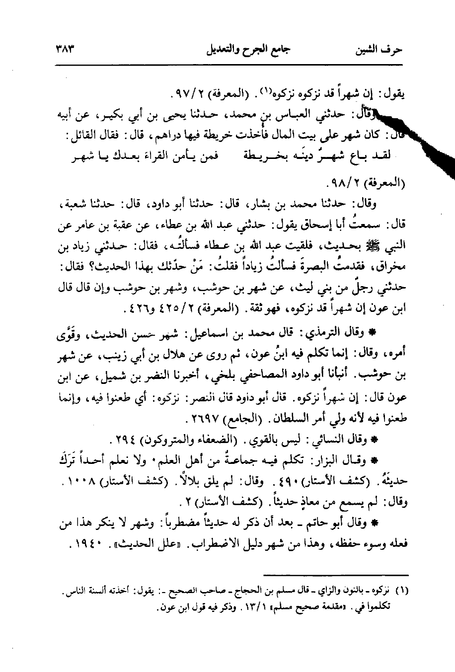 * وقال الترمذي: قال محمد بن إسماعيل: شهر حسن الحديث، وقَوَّى أمره، وقال: إنما تكلم فيه ابنُ عون، ثم روى عن هلال بن أبي زينب، عن شهر بن حوشب. أنبأنا أبو داود المصاحفي بلخي، أخبرنا النضر بن شميل، عن ابن عون قال: إن شهرًا نزكوه. قال أبو داود قال النصر: نزكوه: أي طعنوا فيه، وإنما طعنوا فيه لأنه ولي أمر السلطان. (الجامع) 2697.