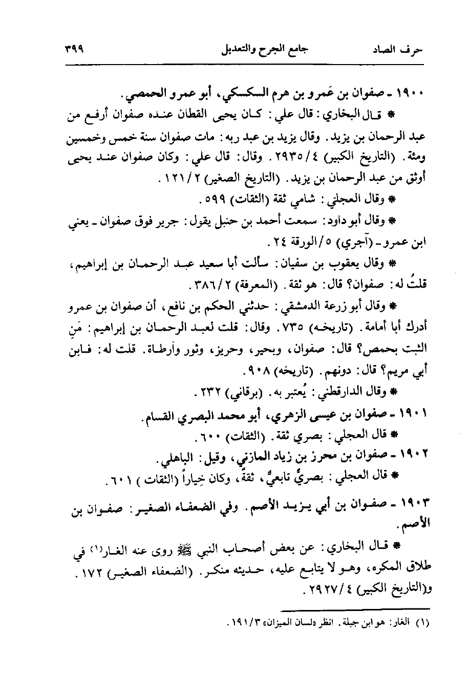* قال البخاري: قال علي: كان يحيى القطان عنده صفوان أرفع من عبد الرحمن بن يزيد. وقال يزيد بن عبد ربه: مات صفوان سنة خمس وخمسين ومئة. (التاريخ الكبير) 4/ 2935. وقال: قال علي: وكان صفوان عند يحيى أوثق من عبد الرحمن بن يزيد. (التاريخ الصغير) 2/ 121.