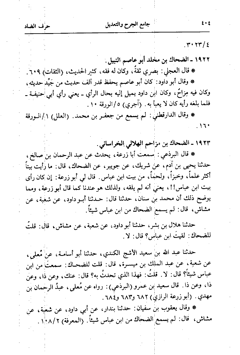حدثنا عبد الله بن سعيد الأشج الكندي، حدثنا أبو أسامة، عن مُعلى، عن شعبة، عن عبد الملك بن ميسرة, قال: قلت للضحاك: سمعتَ من ابن عباس شيئًا؟ قال: لا. قلت: فهذا الذي تحدث به, قال: عنك، وعن ذا، وعن ذا، وعن ذا. قال سعيد بن عمرو (البرذعي): رواه عن مُعلى، عبدُ الرحمن بن مهدي. (أبو زرعة الرازي) 682 و 683 و 684.