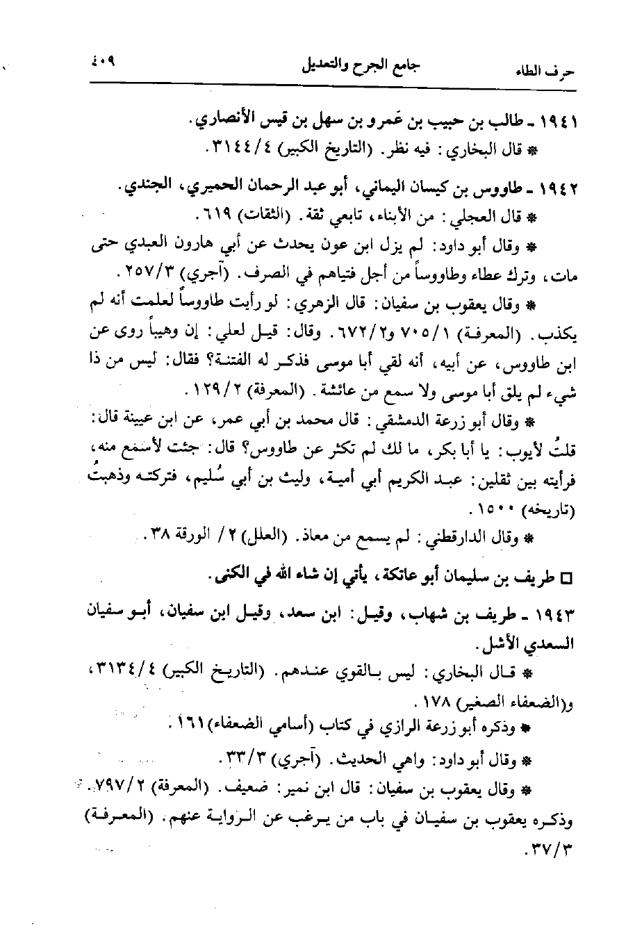 * وقال أبو زرعة الدمشقي: قال محمد بن أبي عمر، عن ابن عيينة قال: قلتُ لأيوب: يا أبا بكر، ما لك لم تكثر عن طاووس؟ قال: جئت لأسمع منه، فرأيته بين ثقلين: عبد الكريم أبي أمية، وليث بن أبي سُليم، فتركه وذهبتُ (تاريخه) 1500.