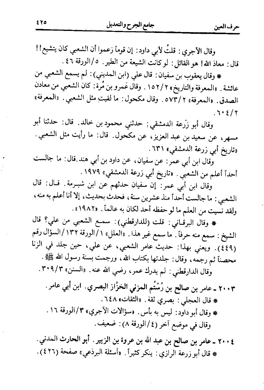 * وقال يعقوب بن سفيان: قال علي (ابن المديني): لم يسمع الشعبي من عائشة. "المعرفة والتاريخ" 2/ 152. وقال عَمرو بن مُرة: كان الشعبي من معادن الصدق. "المعرفة" 2/ 573. وقال مكحول: ما لقيت مثل الشعبي. "المعرفة" 2/ 604.