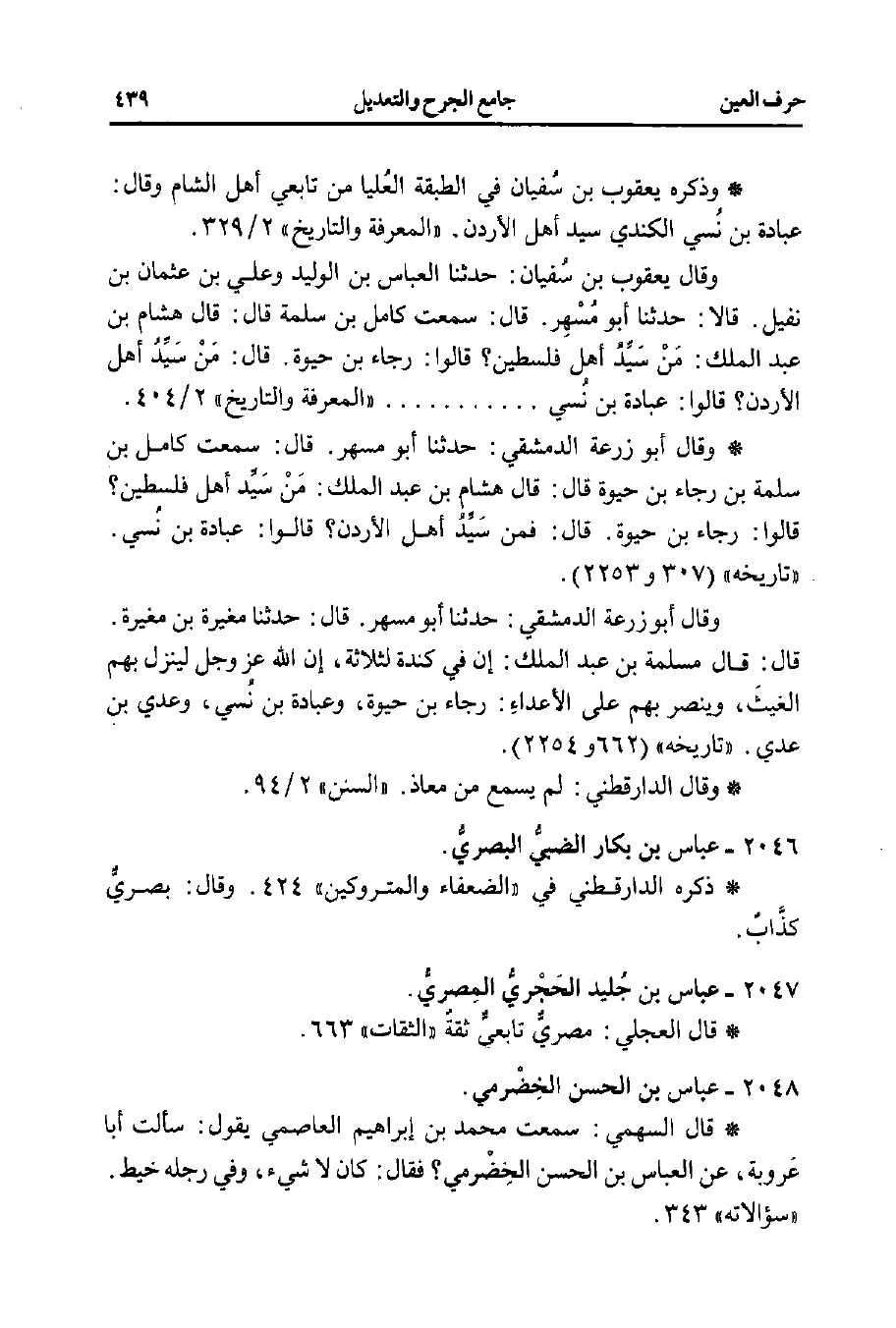 وقال يعقوب بن سُفيان: حدثنا العباس بن الوليد وعلي بن عثمان بن نفيل. قالا: حدثنا أبو مُسْهِر. قال: سمعت كامل بن سلمة قال: قال هشام بن عبد الملك: مَنْ سَيِّدُ أهل فلسطين؟ قالوا: رجاء بن حيوة. قال: مَنْ سَيِّدُ أهل الأردن؟ قالوا: عبادة بن نُسي .......... "المعرفة والتاريخ" 2/ 404.