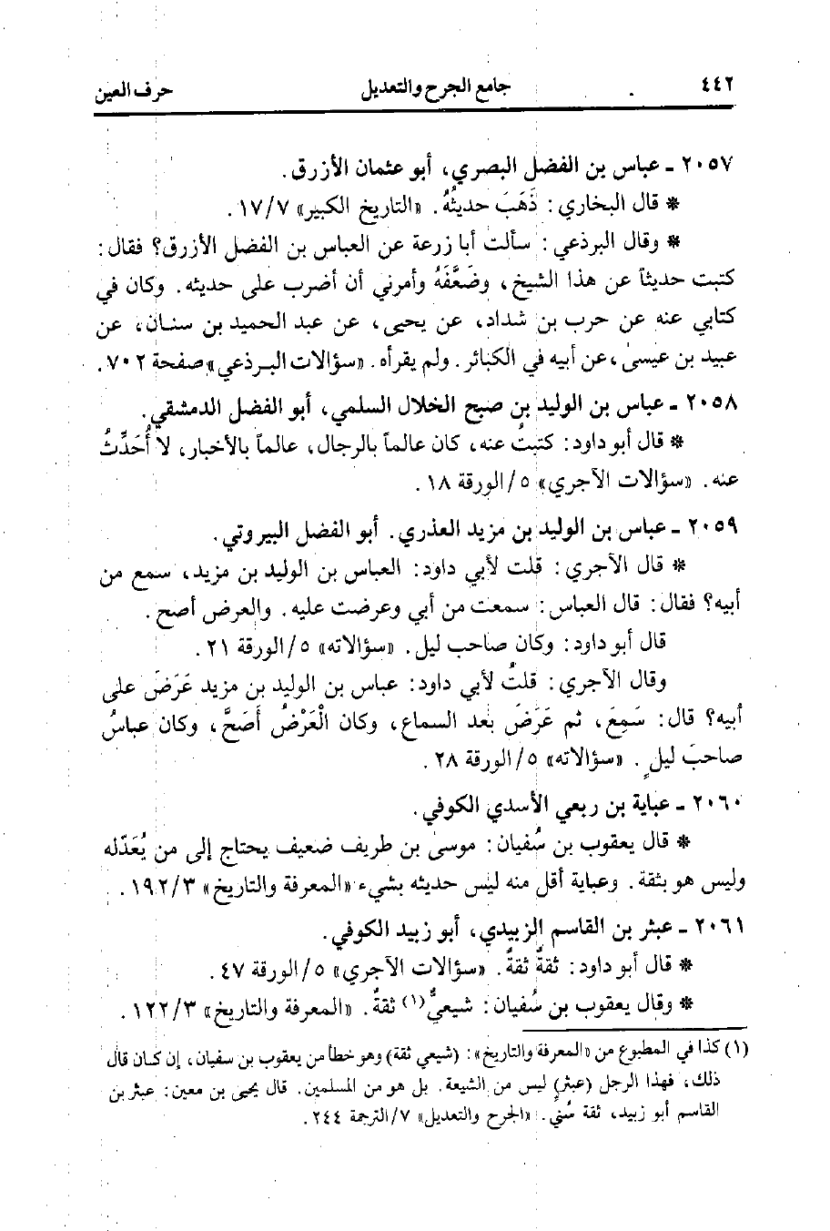 (¬1) كذا في المطبوع من "المعرفة والتاريخ": (شيعي ثقة) وهو خطأ من يعقوب بن سفيان، إن كان قال ذلك، فهذا الرجل (عبثر) من الشيعة. بل هو من المسلمين. قال يحيى بن معين: عبثر بن القاسم أبو زبيد، ثقة سُنِّي. "الجرح والتعديل" 7/ الترجمة 244.