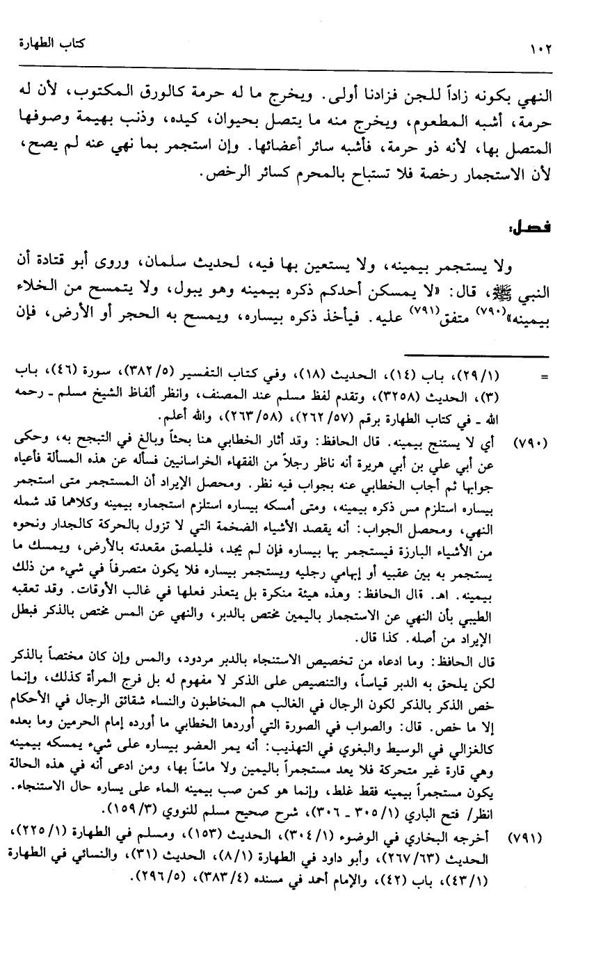النهي بكونه زادا للجن فزادنا أولى. ويخرج ما له حرمة كالورق المكتوب، لأن له حرمة، أشبه المطعوم، ويخرج منه ما يتصل بحيوان، كيده، وذنب بهيمة وصوفها المتصل بها، لأنه ذو حرمة، فأشبه سائر أعضاءها. وإن استجمر بما نهي عنه لم يصح، لأن الاستجمار رخصة فلا تستباح بالمحرم كسائر الرخص.
