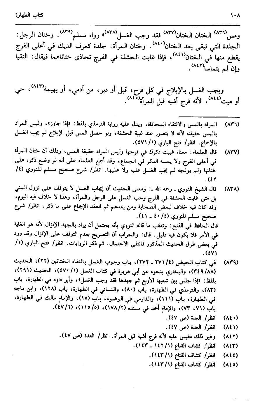 ومس الختان الختان فقد وجب الغسل» رواه مسلم. وختان الرجل: الجلدة التي تبقى بعد الختان، وختان المرأة، جلدة كعرف الديك في أعلى الفرج يقطع منها في الختان، فإذا غابت الحشفة في الفرج تحاذى ختاناهما فيقال: التقيا وإن لم يتماسا.