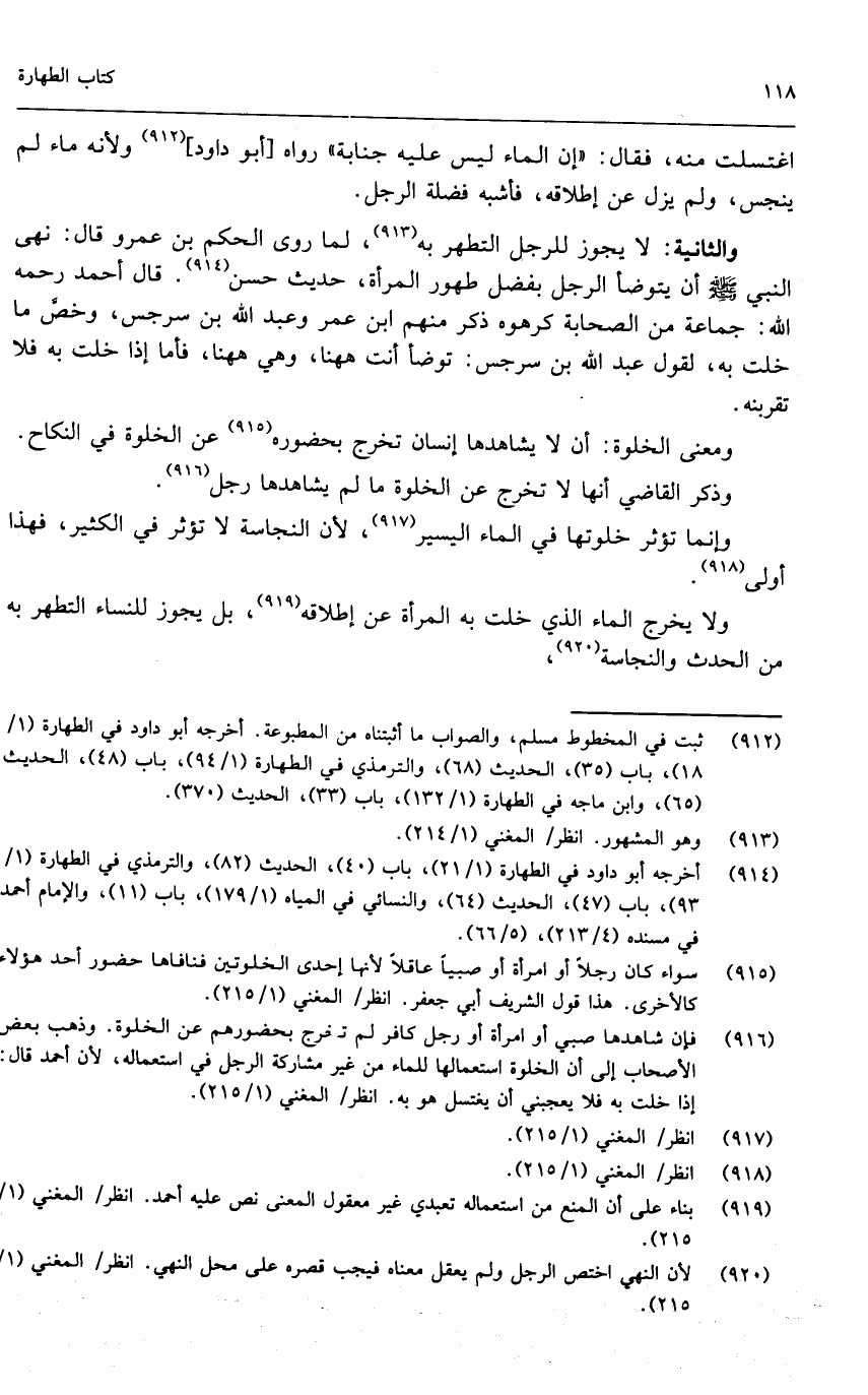 والثانية: لا يجوز للرجل التطهر به، لما روى الحكم بن عمرو قال: «نهى النبي - صَلَّى اللَّهُ عَلَيْهِ وَسَلَّمَ - أن يتوضأ الرجل بفضل طهور المرأة» ، حديث حسن. قال أحمد - رَحِمَهُ اللَّهُ -: جماعة من الصحابة كرهوه ذكر منهم ابن عمر وعبد الله بن سرجس، وخص ما خلت به، لقول عبد الله بن سرجس: توضأ أنت ههنا، وهي ههنا، فأما إذا خلت به فلا تقربنه.