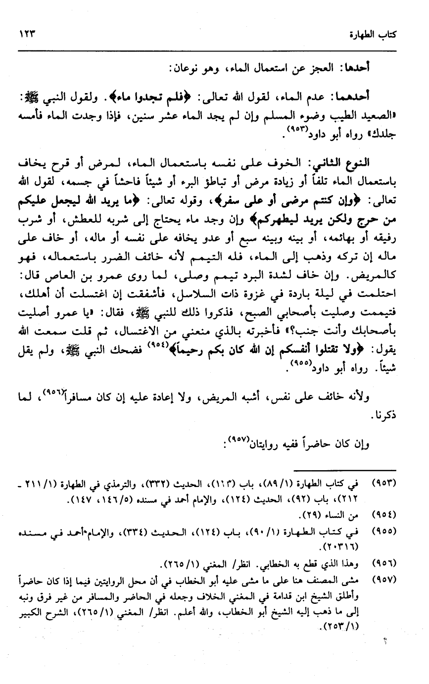 النوع الثاني: الخوف على نفسه باستعمال الماء، لمرض أو قرح يخاف باستعمال الماء تلفا أو زيادة مرض أو تباطؤ البرء أو شيئا فاحشا في جسمه، لقول الله تعالى: {وَإِنْ كُنْتُمْ مَرْضَى أَوْ عَلَى سَفَرٍ} [النساء: 43] ، وقَوْله تَعَالَى: {مَا يُرِيدُ اللَّهُ لِيَجْعَلَ عَلَيْكُمْ مِنْ حَرَجٍ وَلَكِنْ يُرِيدُ لِيُطَهِّرَكُمْ} [المائدة: 6] وإن وجد ماء يحتاج إلى شربه للعطش، أو شرب رفيقه أو بهائمه، أو بينه وبينه سبع أو عدو يخافه على نفسه أو ماله، أو خاف على ماله إن تركه وذهب إلى الماء، فله التيمم لأنه خائف الضرر باستعماله، فهو كالمريض. وإن خاف لشدة البرد تيمم وصلى، لما روى عمرو بن العاص قال: «احتلمت في ليلة باردة في غزوة ذات السلاسل، فأشفقت إن اغتسلت أن أهلك، فتيممت وصليت بأصحابي الصبح، فذكروا ذلك للنبي - صَلَّى اللَّهُ عَلَيْهِ وَسَلَّمَ -، فقال: " يا عمرو أصليت بأصحابك وأنت جنب؟ " فأخبرته بالذي منعني من الاغتسال، ثم قلت سمعت الله يقول: {وَلا تَقْتُلُوا أَنْفُسَكُمْ إِنَّ اللَّهَ كَانَ بِكُمْ رَحِيمًا} [النساء: 29] فضحك النبي - صَلَّى اللَّهُ عَلَيْهِ وَسَلَّمَ - ولم يقل شيئا» . رواه أبو داود.