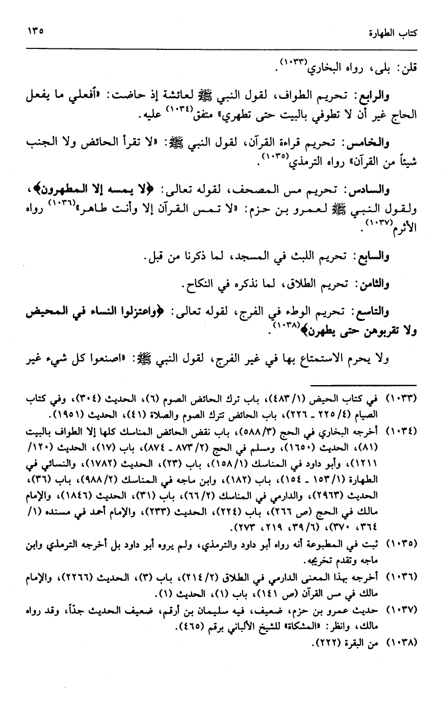 والتاسع: تحريم الوطء في الفرج؛ لِقَوْلِهِ تَعَالَى: {فَاعْتَزِلُوا النِّسَاءَ فِي الْمَحِيضِ وَلا تَقْرَبُوهُنَّ حَتَّى يَطْهُرْنَ} [البقرة: 222] .