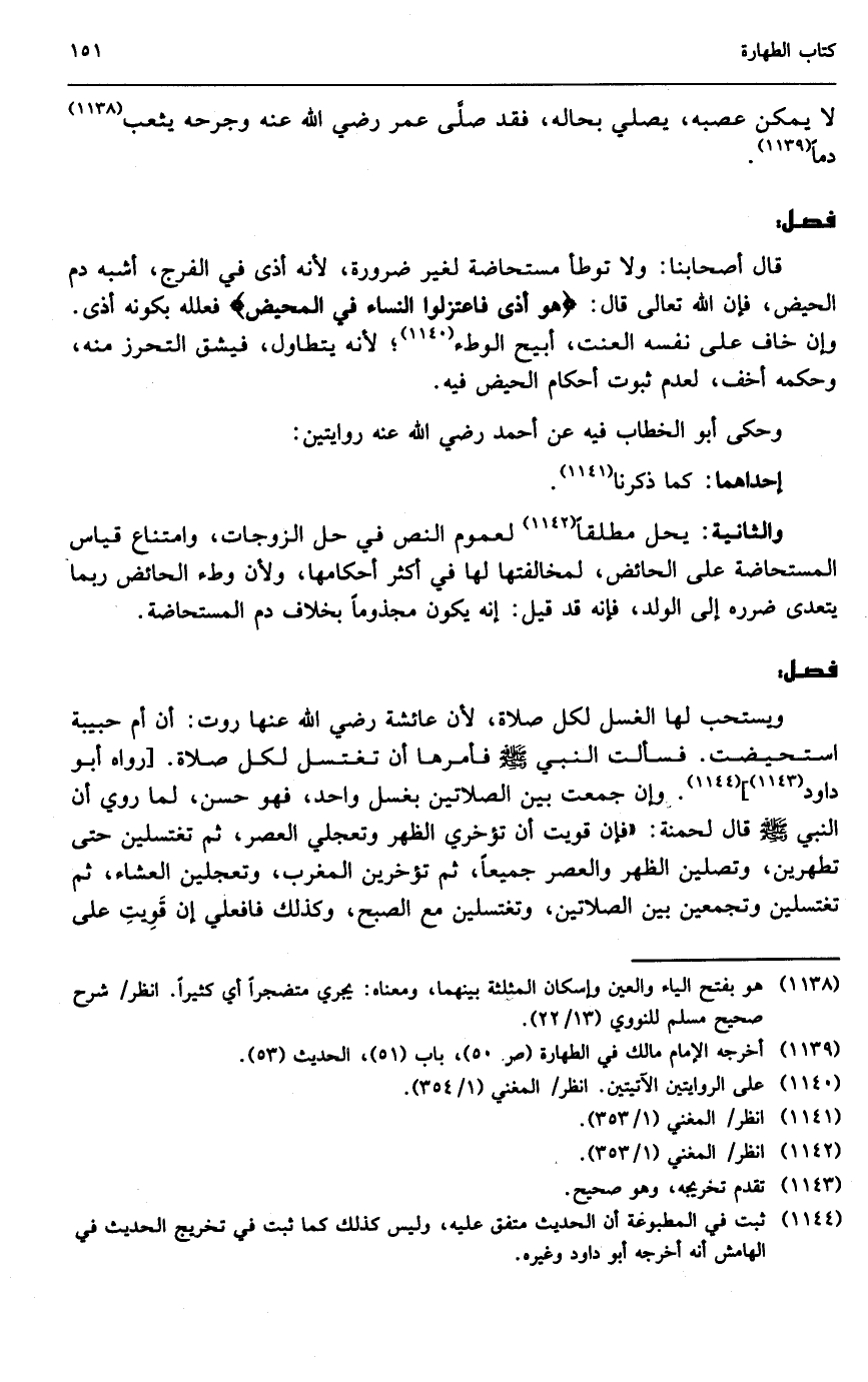 قال أصحابنا: ولا توطأ مستحاضة لغير ضرورة؛ لأنه أذى في الفرج، أشبه دم الحيض، فإن الله تعالى قال: {هُوَ أَذًى فَاعْتَزِلُوا النِّسَاءَ فِي الْمَحِيضِ} [البقرة: 222] فعلله بكونه أذى، وإن خاف على نفسه العنت، أبيح الوطء؛ لأنه يتطاول، فيشق التحرز منه، وحكمه أخف، لعدم ثبوت أحكام الحيض فيه، وحكى أبو الخطاب فيه عن أحمد - رَضِيَ اللَّهُ عَنْهُ - روايتان: إحداهما: كما ذكرنا.