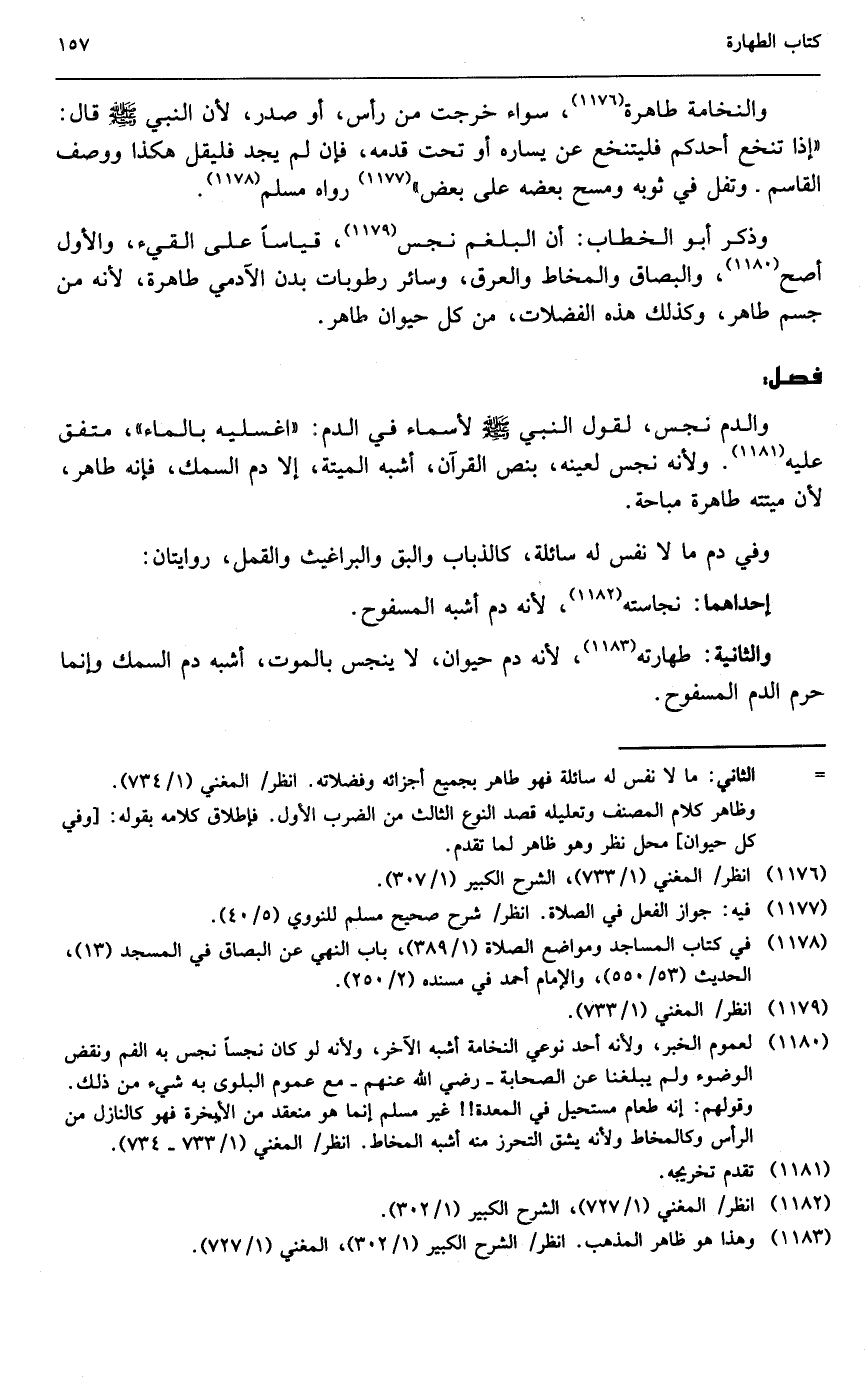 والدم نجس؛ لقول النبي - صَلَّى اللَّهُ عَلَيْهِ وَسَلَّمَ - لأسماء في الدم: «اغسليه بالماء» متفق عليه، ولأنه نجس لعينه، بنص القرآن، أشبه الميتة، إلا دم السمك، فإنه طاهر؛ لأن ميتته طاهرة مباحة.