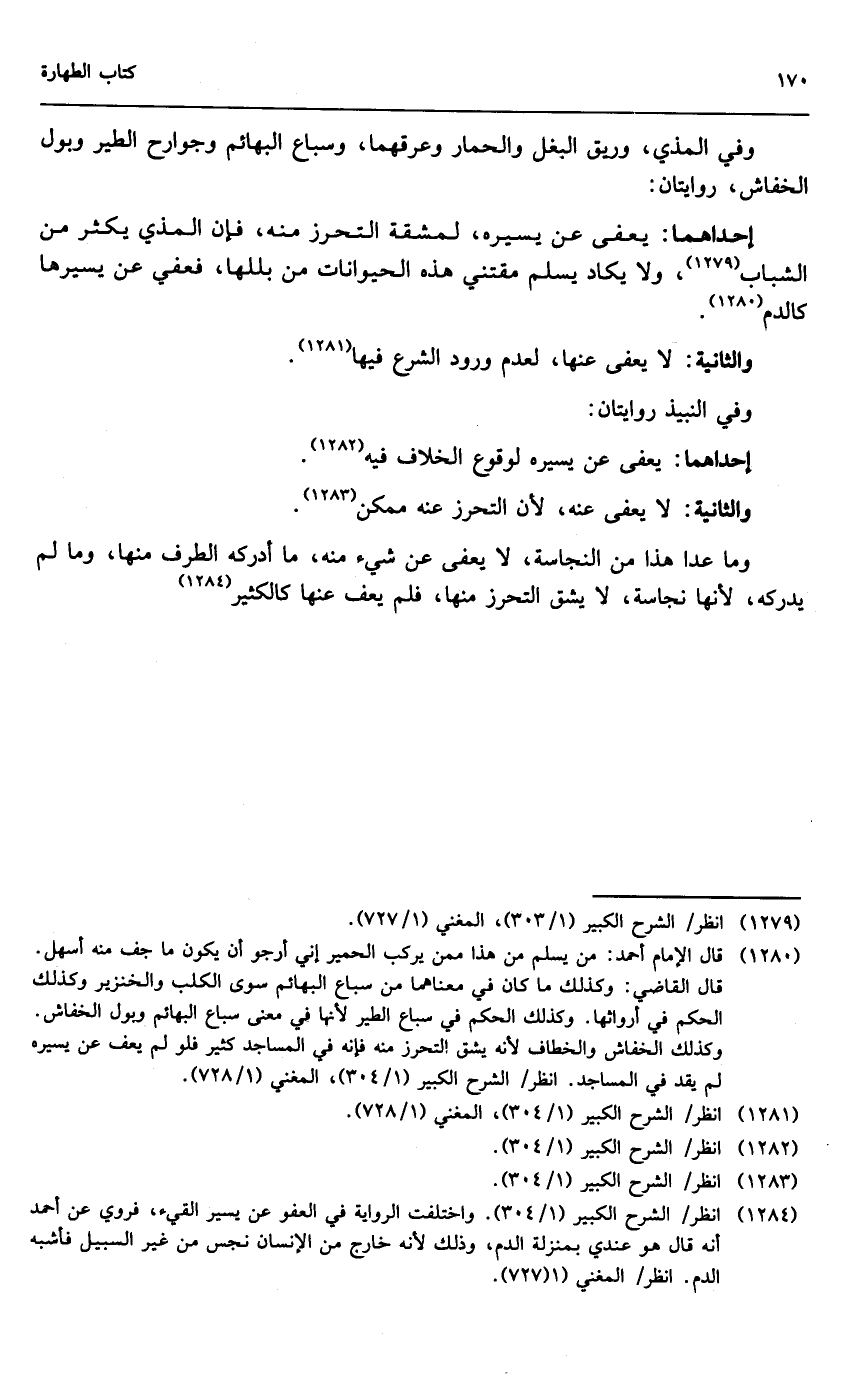 وفي المذي، وريق البغل والحمار وعرقهما، وسباع البهائم وجوارح الطير وبول الخفاش، روايتان: إحداهما: يعفى عن يسيره، لمشقة التحرز منه، فإن المذي يكثر من الشباب، ولا يكاد يسلم مقتني هذه الحيوانات من بللها، فعفي عن يسيرها كالدم.