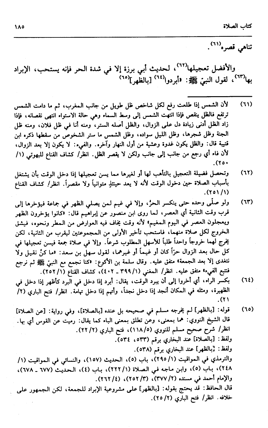 تناهي قصره، والأفضل تعجيلها، لحديث أبي برزة إلا في شدة الحر فإنه يستحب، الإبراد بها، لقول النبي - صَلَّى اللَّهُ عَلَيْهِ وَسَلَّمَ -: «أبردوا [بالظهر]
