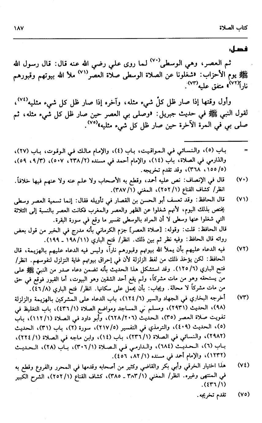 ثم العصر، وهي الوسطى لما روى علي - رَضِيَ اللَّهُ عَنْهُ - قال: قال رسول الله - صَلَّى اللَّهُ عَلَيْهِ وَسَلَّمَ - يوم الأحزاب: «شغلونا عن الصلاة الوسطى صلاة العصر ملأ الله بيوتهم وقبورهم ناراً» متفق عليه، وأول وقتها إذا صار ظل كل شيء مثله، وآخره إذا صار ظل كل شيء مثليه، لقول النبي - صَلَّى اللَّهُ عَلَيْهِ وَسَلَّمَ - في حديث جبريل: «وصلى بي العصر حين صار ظل كل شيء مثله، ثم صلى بي المرة الآخرة حين صار ظل كل شيء مثليه»