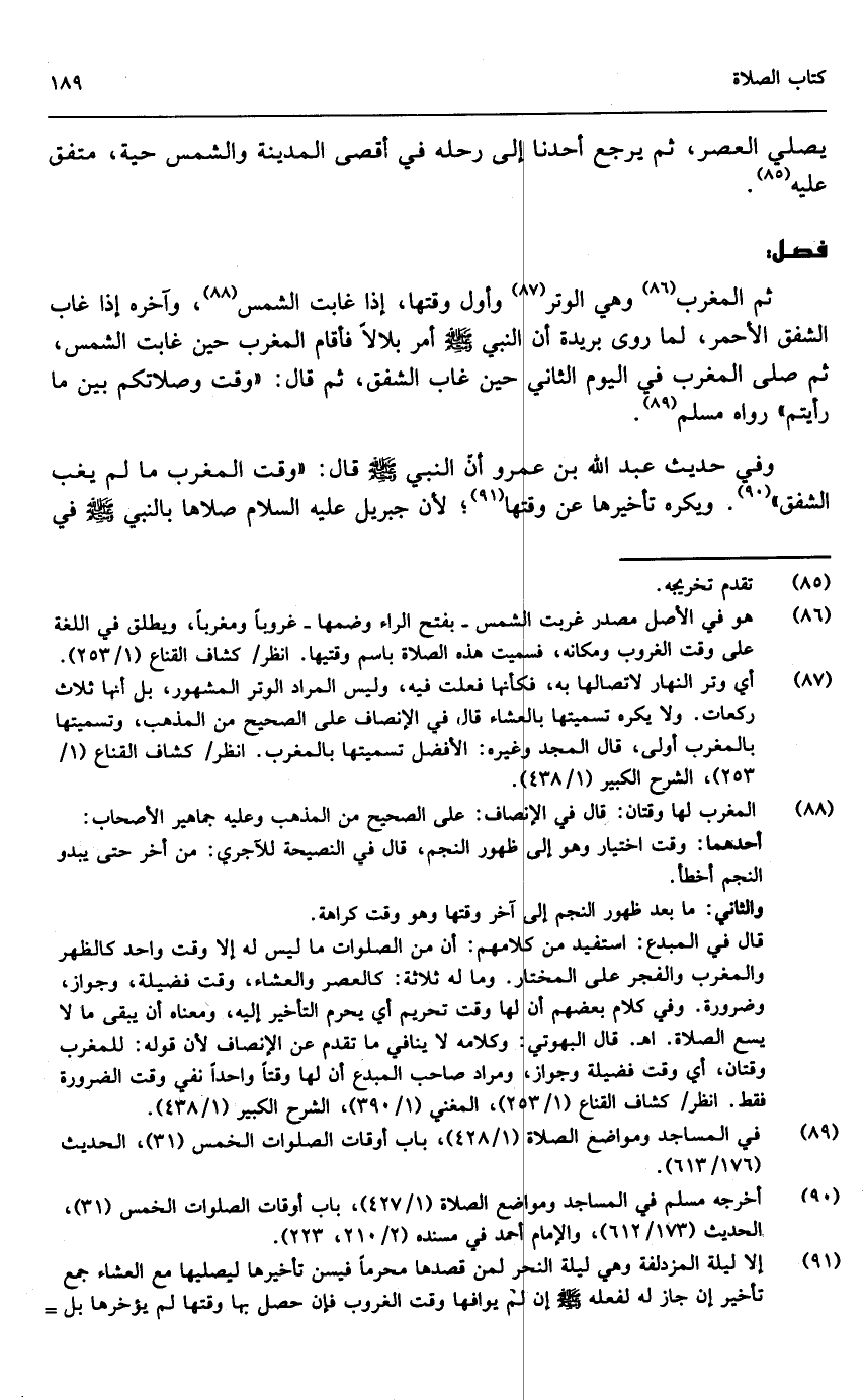 ثم المغرب وهي الوتر وأول وقتها، إذا غابت الشمس، وآخره إذا غاب الشفق الأحمر، لما روى بريدة «أن النبي - صَلَّى اللَّهُ عَلَيْهِ وَسَلَّمَ - أمر بلالاً فأقام المغرب حين غابت الشمس، ثم صلى المغرب في اليوم الثاني حين غاب الشفق، ثم قال: وقت وصلاتكم بين ما رأيتم» رواه مسلم، وفي حديث عبد الله بن عمرو أن النبي - صَلَّى اللَّهُ عَلَيْهِ وَسَلَّمَ - قال: «وقت المغرب ما لم يغب الشفق» ويكره تأخيرها عن وقتها؛ لأن جبريل - عَلَيْهِ السَّلَامُ - صلاها بالنبي - صَلَّى اللَّهُ عَلَيْهِ وَسَلَّمَ - في