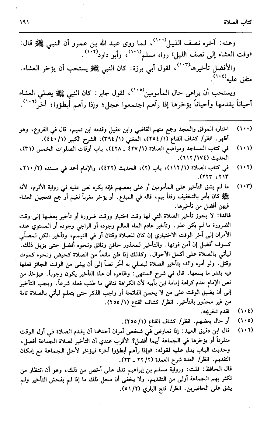 وعنه: آخره نصف الليل، لما روى عبد الله بن عمرو: أن النبي (- صَلَّى اللَّهُ عَلَيْهِ وَسَلَّمَ -) قال: «وقت العشاء إلى نصف الليل» رواه مسلم وأبو داود، والأفضل تأخيرها لقول أبي برزة: «كان النبي - صَلَّى اللَّهُ عَلَيْهِ وَسَلَّمَ - يستحب أن يؤخر العشاء» متفق عليه.