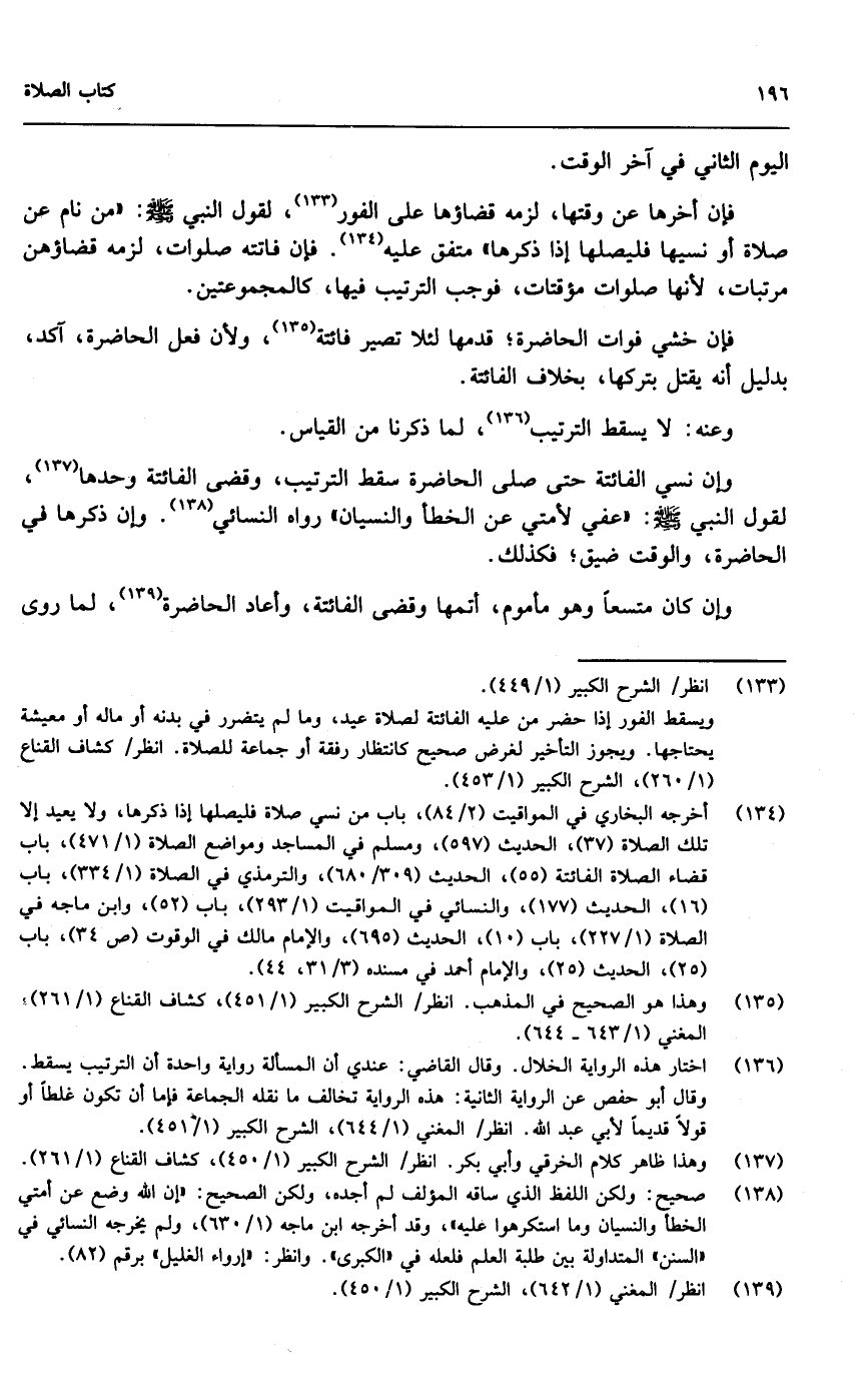 وإن نسي الفائتة حتى صلى الحاضرة سقط الترتيب، وقضى الفائتة وحدها، لقول النبي - صَلَّى اللَّهُ عَلَيْهِ وَسَلَّمَ -: «عفي لأمتي عن الخطأ والنسيان» رواه النسائي. وإن ذكرها في الحاضرة، والوقت ضيق، فكذلك.