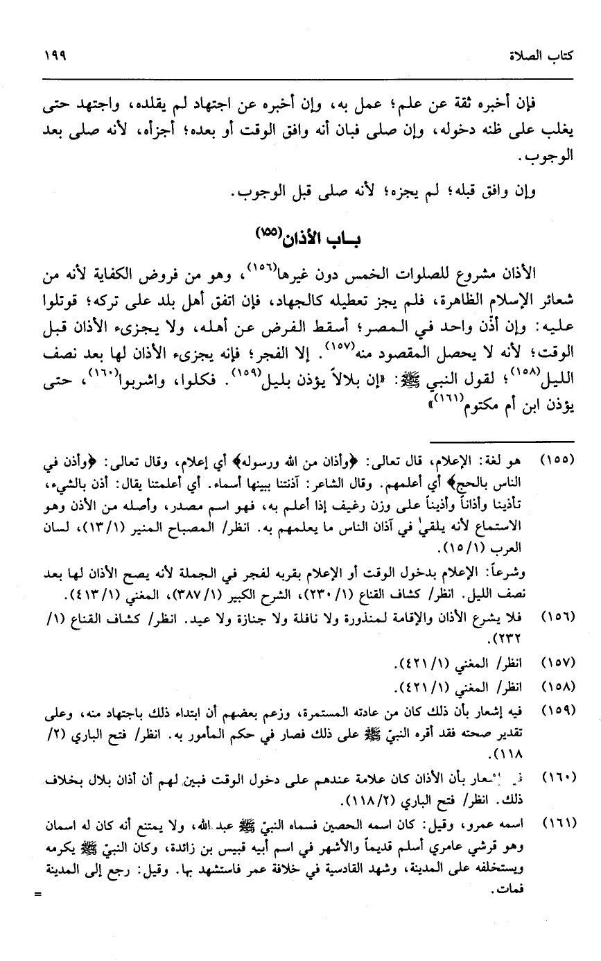 الأذان مشروع للصلوات الخمس دون غيرها، وهو من فروض الكفاية؛ لأنه من شعائر الإسلام الظاهرة، فلم يجز تعطيله، كالجهاد، فإن اتفق أهل بلد على تركه، قوتلوا عليه، وإن أذن واحد في المصر أسقط الفرض عن أهله، ولا يجزئ الأذان قبل الوقت، لأنه لا يحصل المقصود منه، إلا الفجر، فإنه يجزئ الأذان لها بعد نصف الليل؛ لقول النبي - صَلَّى اللَّهُ عَلَيْهِ وَسَلَّمَ -: «إن بلالاً يؤذن بليل؛ فكلوا واشربوا حتى يؤذن ابن أم مكتوم»