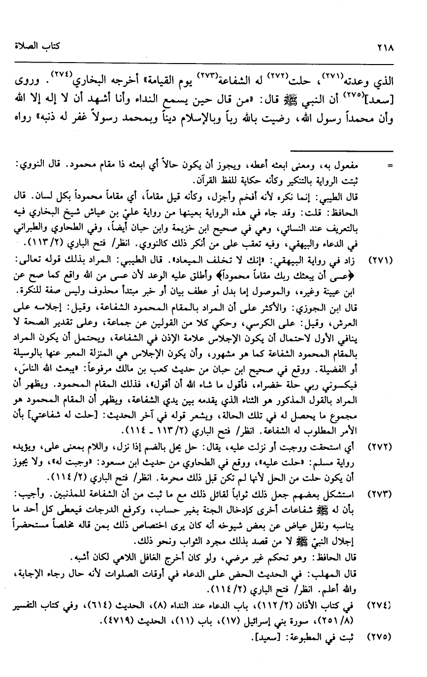الذي وعدته، حلت له الشفاعة يوم القيامة» أخرجه البخاري. وروى [سعد] أن النبي - صَلَّى اللَّهُ عَلَيْهِ وَسَلَّمَ - قال: «من قال حين يسمع النداء: وأنا أشهد أن لا إله إلا الله وأن محمداً رسول الله، رضيت بالله رباً وبالإسلام ديناً وبمحمد رسولاً، غفر له ذنبه» رواه