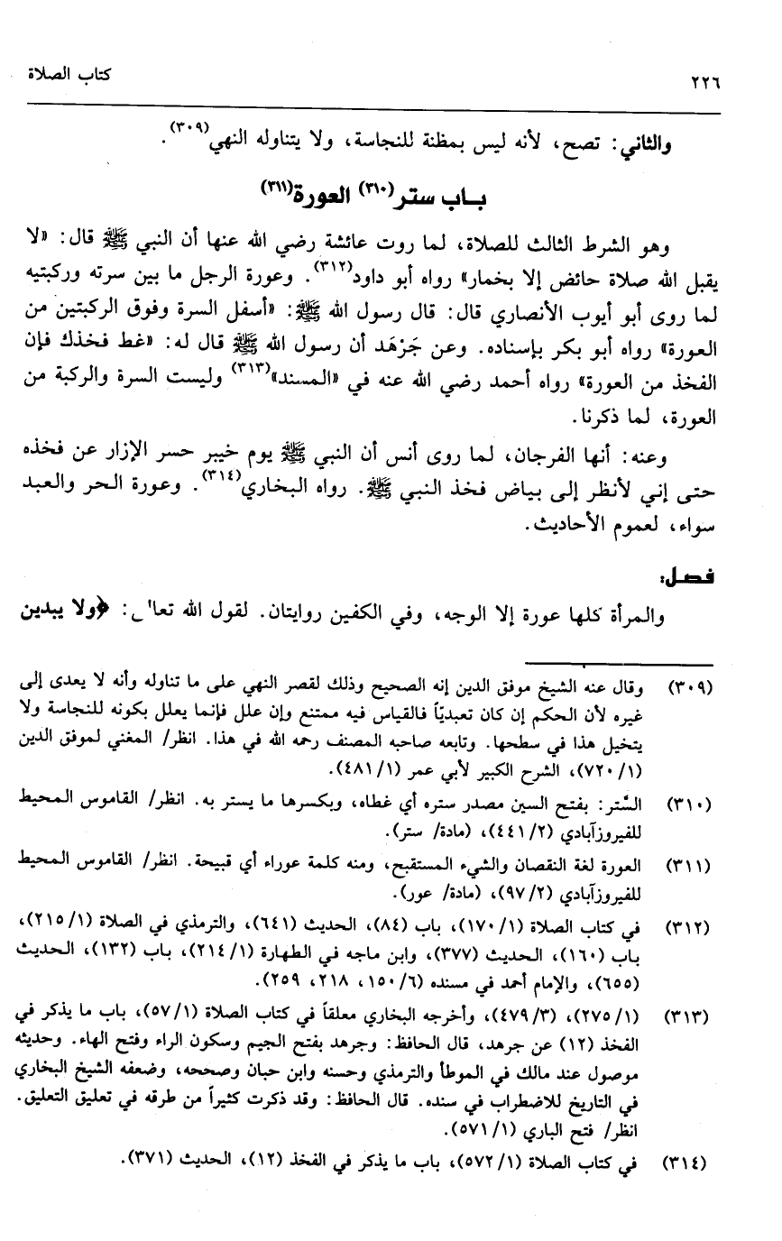 وهو الشرط الثالث للصلاة، لما روت عائشة - رَضِيَ اللَّهُ عَنْهَا - أن النبي - صَلَّى اللَّهُ عَلَيْهِ وَسَلَّمَ - قال: «لا يقبل الله صلاة حائض إلا بخمار» رواه أبو داود. وعورة الرجل ما بين سرته وركبتيه لما روى أبو أيوب الأنصاري قال: قال رسول الله - صَلَّى اللَّهُ عَلَيْهِ وَسَلَّمَ -: «أسفل السرة وفوق الركبتين من العورة» رواه أبو بكر بإسناده. وعن جرهد أن رسول الله - صَلَّى اللَّهُ عَلَيْهِ وَسَلَّمَ - قال: «غط فخذك فإن الفخذ من العورة» رواه أحمد - رَضِيَ اللَّهُ عَنْهُ - في المسند، وليست السرة والركبة من العورة، لما ذكرنا.