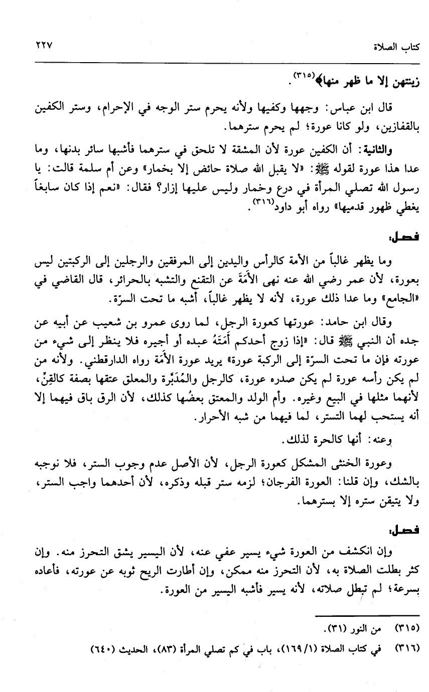 والثانية: أن الكفين عورة لأن المشقة لا تلحق في سترهما فأشبها سائر بدنها، وما عدا هذا عورة؛ لقول رسول الله - صَلَّى اللَّهُ عَلَيْهِ وَسَلَّمَ -: «لا يقبل الله صلاة حائض إلا بخمار» وعن أم سلمة قالت: «يا رسول الله تصلي المرأة في درع وخمار وليس عليها إزار؟ فقال: نعم إذا كان سابغاً يغطي ظهور قدميها» رواه أبو داود.