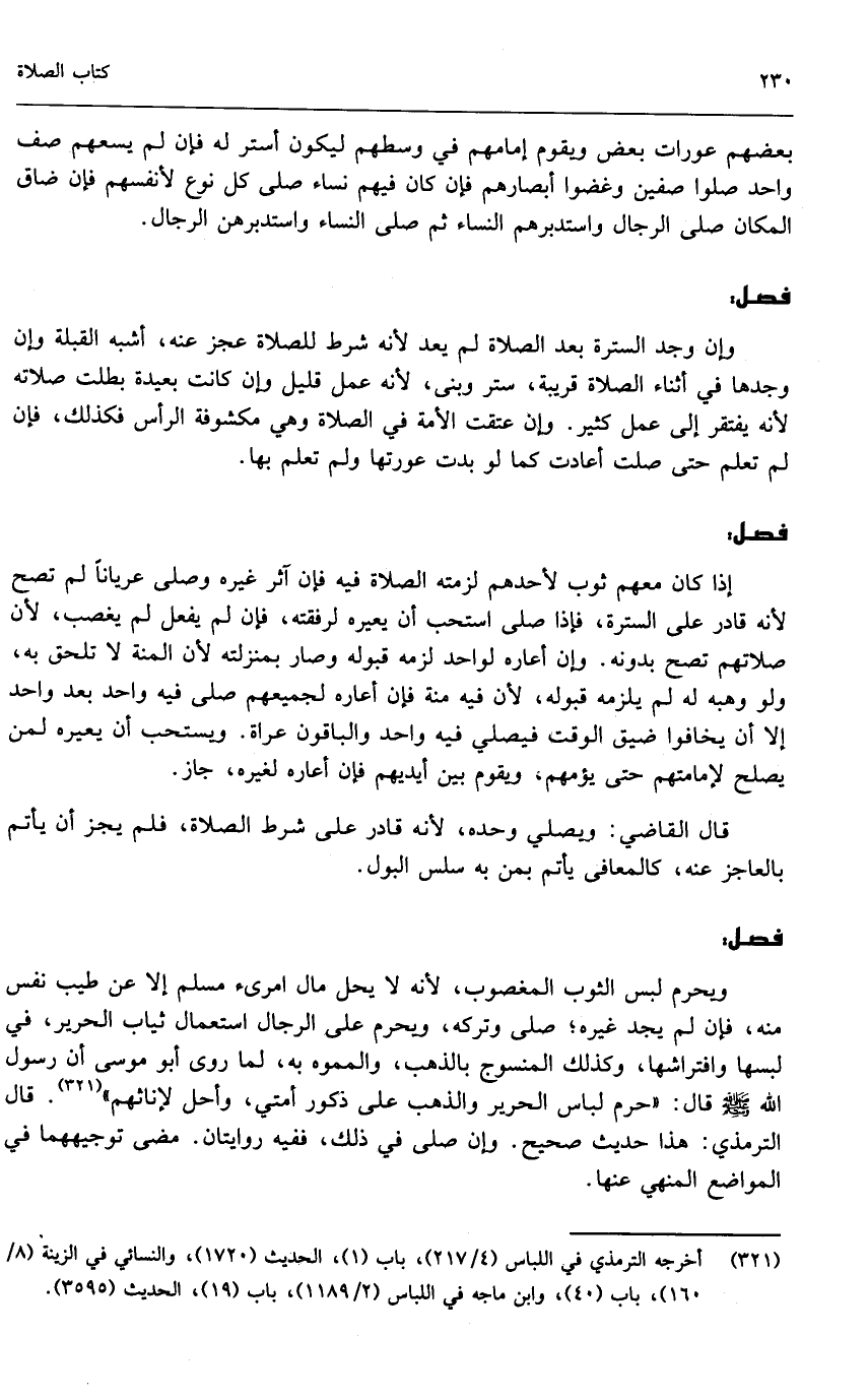 ويحرم لبس الثوب المغصوب، لأنه لا يحل مال امرئ مسلم إلا عن طيب نفس منه، فإن لم يجد غيره، صلى وتركه، ويحرم على الرجال استعمال ثياب الحرير، في لبسها وافتراشها، وكذلك المنسوج بالذهب، والمموه به، لما روى أبو موسى أن رسول الله - صَلَّى اللَّهُ عَلَيْهِ وَسَلَّمَ - قال: «حرم لباس الحرير والذهب على ذكور أمتي، وأحل لإناثهم» . قال الترمذي: هذا حديث صحيح. وإن صلى في ذلك، ففيه روايتان. مضى توجيههما في المواضع المنهي عنها.
