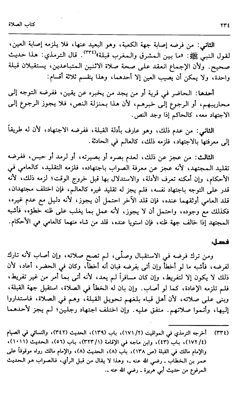 الثاني: من فرضه إصابة جهة الكعبة، وهو البعيد عنها فلا يلزمه إصابة العين، لقول النبي - صَلَّى اللَّهُ عَلَيْهِ وَسَلَّمَ -: «ما بين المشرق والمغرب قبلة» . قال الترمذي: هذا حديث صحيح. ولأن الإجماع انعقد على صحة صلاة الاثنين المتباعدين، يستقبلان قبلة واحدة، ولا يمكن أن يصيب العين إلا أحدهما، وهذا ينقسم ثلاثة أقسام:
