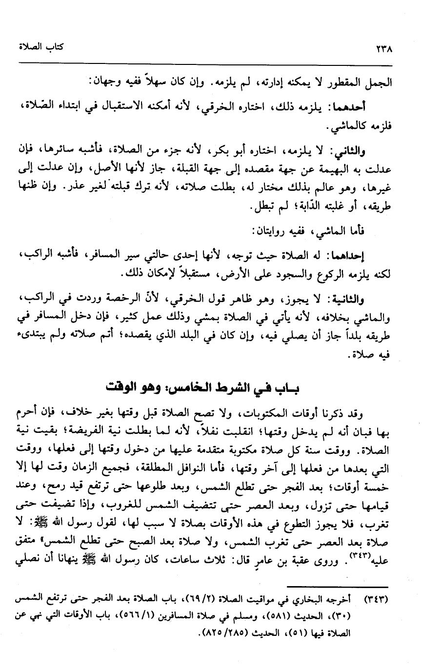 باب في الشرط الخامس: وهو الوقت وقد ذكرنا أوقات المكتوبات، ولا تصح الصلاة قبل وقتها بغير خلاف، فإن أحرم بها فبان أنه لم يدخل وقتها، انقلبت نفلاً، لأنه لما بطلت نية الفريضة، بقيت نية الصلاة. ووقت سنة كل صلاة مكتوبة متقدمة عليها من دخول وقتها إلى فعلها، ووقت التي بعدها من فعلها إلى آخر وقتها، فأما النوافل المطلقة، فجميع الزمان وقت لها إلا خمسة أوقات، بعد الفجر حتى تطلع الشمس، وبعد طلوعها حتى ترتفع قيد رمح، وعند قيامها حتى تنزل، وبعد العصر حتى تتضيف الشمس للغروب، وإذا تضيفت حتى تغرب، فلا يجوز التطوع في هذه الأوقات بصلاة لا سبب لها، لقول رسول الله - صَلَّى اللَّهُ عَلَيْهِ وَسَلَّمَ -: «لا صلاة بعد العصر حتى تغرب الشمس، ولا صلاة بعد الصبح حتى تطلع الشمس» متفق عليه. وروى عقبة بن عامر قال: «ثلاث ساعات، كان رسول الله - صَلَّى اللَّهُ عَلَيْهِ وَسَلَّمَ - ينهانا أن نصلي