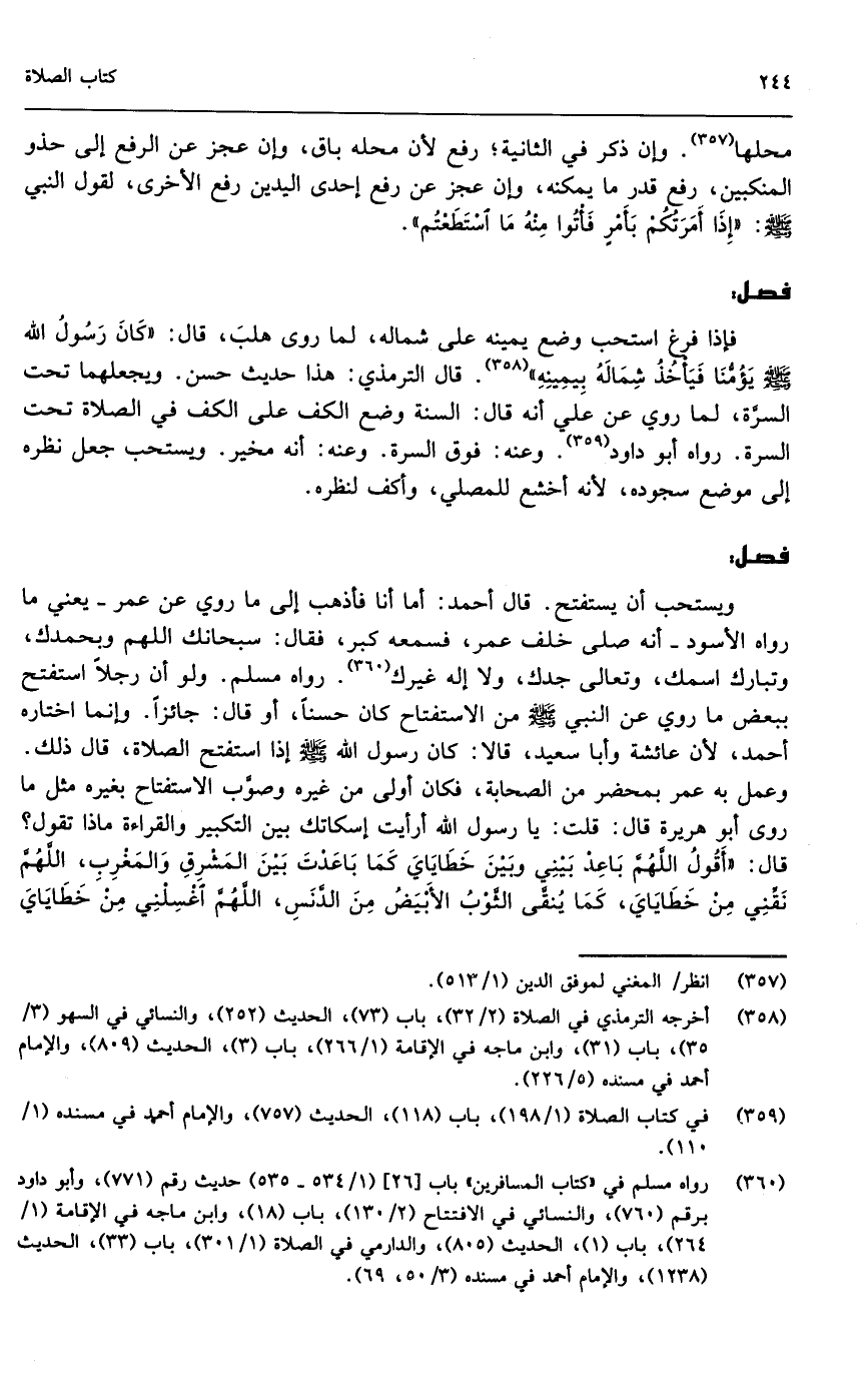 ويستحب أن يستفتح. قال أحمد: أما أنا فأذهب إلى ما روي عن عمر - يعني ما رواه الأسود - أنه صلى خلف عمر، فسمعه كبر، فقال: «سبحانك اللهم وبحمدك، وتبارك اسمك، وتعالى جدك، ولا إله غيرك» . رواه مسلم. ولو أن رجلاً استفتح ببعض ما روي عن النبي - صَلَّى اللَّهُ عَلَيْهِ وَسَلَّمَ - من الاستفتاح كان حسناً، أو قال: جائزاً. وإنما اختاره أحمد، لأن عائشة وأبا سعيد، قالا: كان رسول الله - صَلَّى اللَّهُ عَلَيْهِ وَسَلَّمَ - إذا استفتح الصلاة، قال ذلك. وعمل به عمر بمحضر من الصحابة، فكان أولى من غيره، وصوب الاستفتاح بغيره مثل ما روى أبو هريرة قال: «قلت: يا رسول الله أرأيت إسكاتك بين التكبير والقراءة ماذا تقول؟ قال: أقول: اللهم باعد بيني وبين خطاياي كما باعدت بين المشرق والمغرب، اللهم نقني من خطاياي، كما ينقى الثوب الأبيض من الدنس، اللهم اغسلني من خطاياي