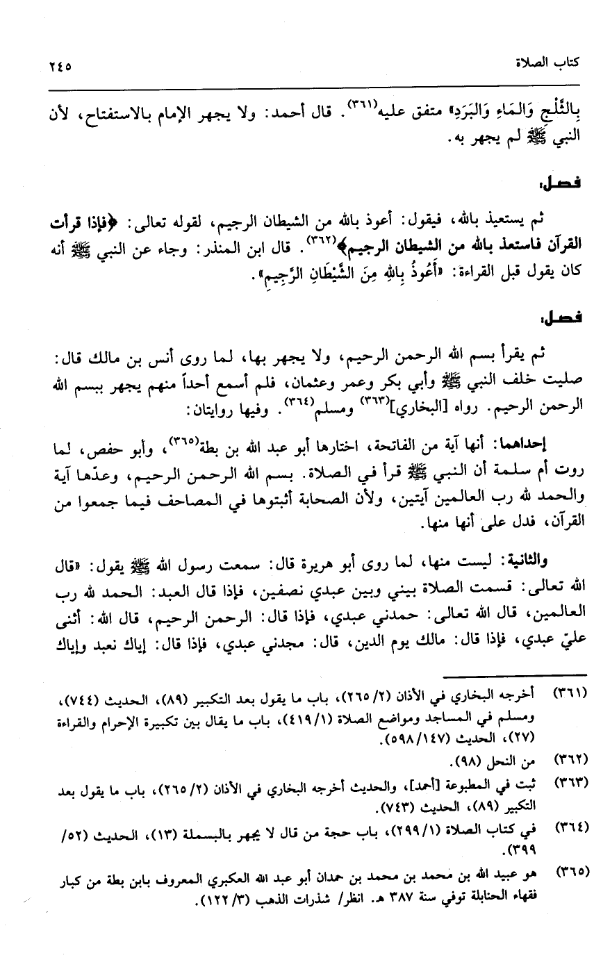 ثم يقرأ بِسْمِ اللَّهِ الرَّحْمَنِ الرَّحِيمِ، ولا يجهر بها، لما روى أنس بن مالك قال: «صليت خلف النبي - صَلَّى اللَّهُ عَلَيْهِ وَسَلَّمَ - وأبي بكر وعمر وعثمان، فلم أسمع أحداً منهم يجهر ببسم الله الرحمن الرحيم» . رواه البخاري ومسلم. وفيها روايتان: