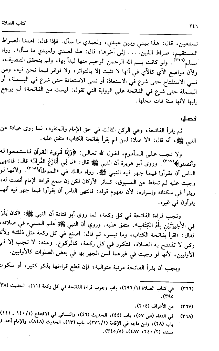 نستعين، قال: هذا بيني وبين عبدي، ولعبدي ما سأل. فإذا قال: اهدنا الصراط المستقيم، صراط الذين ... إلى آخرها، قال: هذا لعبدي ولعبدي ما سأل» رواه مسلم. ولو كانت بِسْمِ اللَّهِ الرَّحْمَنِ الرَّحِيمِ منها لبدأ بها، ولم يتحقق التنصيف، ولأن مواضع الآي كالآي في أنها لا تثبت إلا بالتواتر، ولا تواتر فيما نحن فيه، ومن نسي الاستفتاح حتى شرع في الاستعاذة أو نسي الاستعاذة حتى شرع في البسملة، أو البسملة حتى شرع في الفاتحة على الرواية التي تقول: ليست من الفاتحة، لم يرجع إليها لأنها سنة فات محلها.