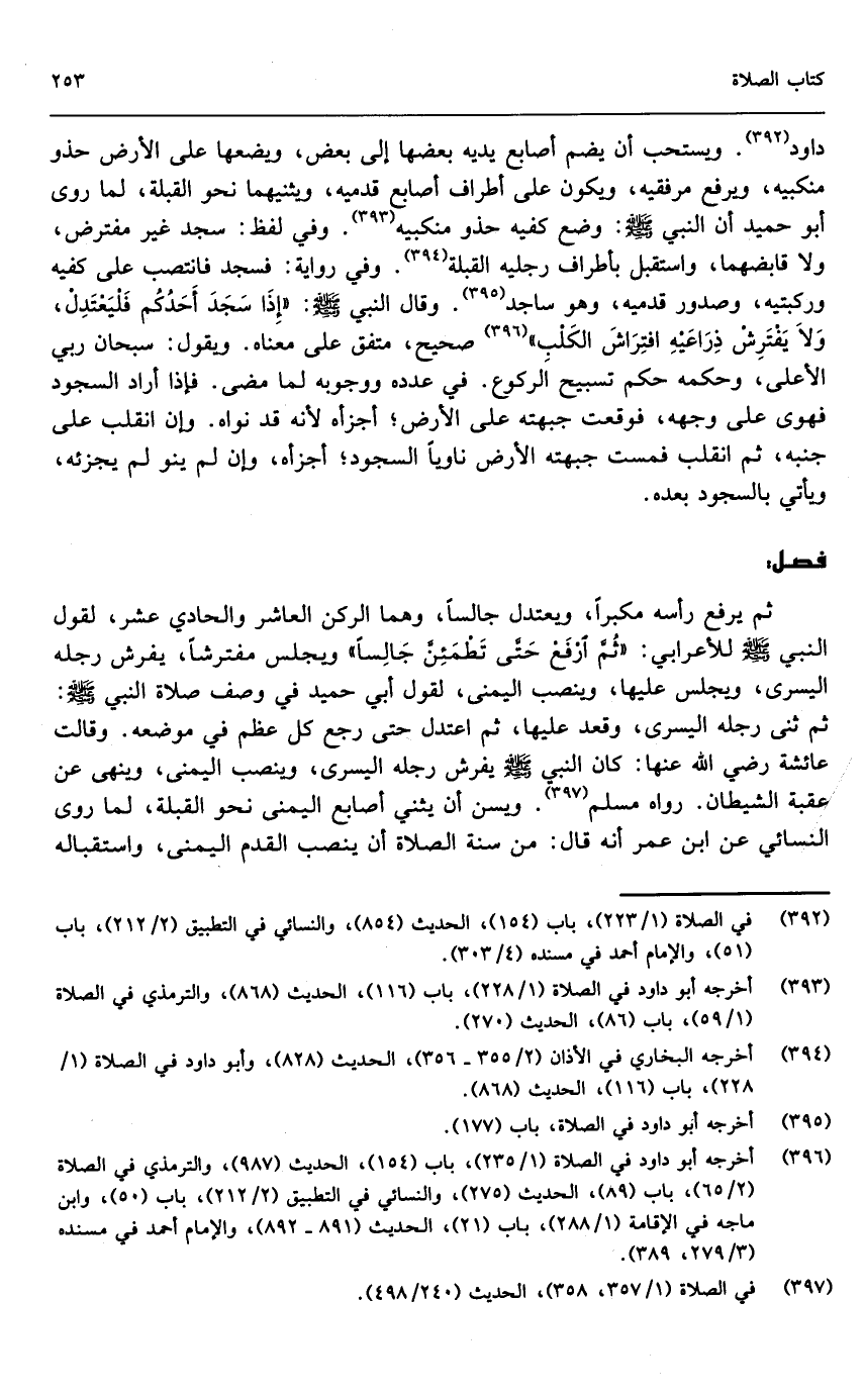 فصل: ثم يرفع رأسه مكبراً، ويعتدل جالساً، وهما الركن العاشر والحادي عشر، لقول النبي - صَلَّى اللَّهُ عَلَيْهِ وَسَلَّمَ - للأعرابي: «ثم ارفع حتى تطمئن جالساً» ويجلس مفترشاً، يفرش رجله اليسرى، ويجلس عليها، وينصب اليمنى، لقول أبي حميد في وصف صلاة النبي - صَلَّى اللَّهُ عَلَيْهِ وَسَلَّمَ -: «ثم ثنى رجله اليسرى، وقعد عليها، ثم اعتدل حتى رجع كل عظم في موضعه» . وقالت عائشة - رَضِيَ اللَّهُ عَنْهَا -: «كان النبي - صَلَّى اللَّهُ عَلَيْهِ وَسَلَّمَ - يفرش رجله اليسرى، وينصب اليمنى، وينهى عن عقبة الشيطان» . رواه مسلم. ويسن أن يثني أصابع اليمنى نحو القبلة، لما روى النسائي عن ابن عمر أنه قال: «من سنة الصلاة أن ينصب القدم اليمنى، واستقباله