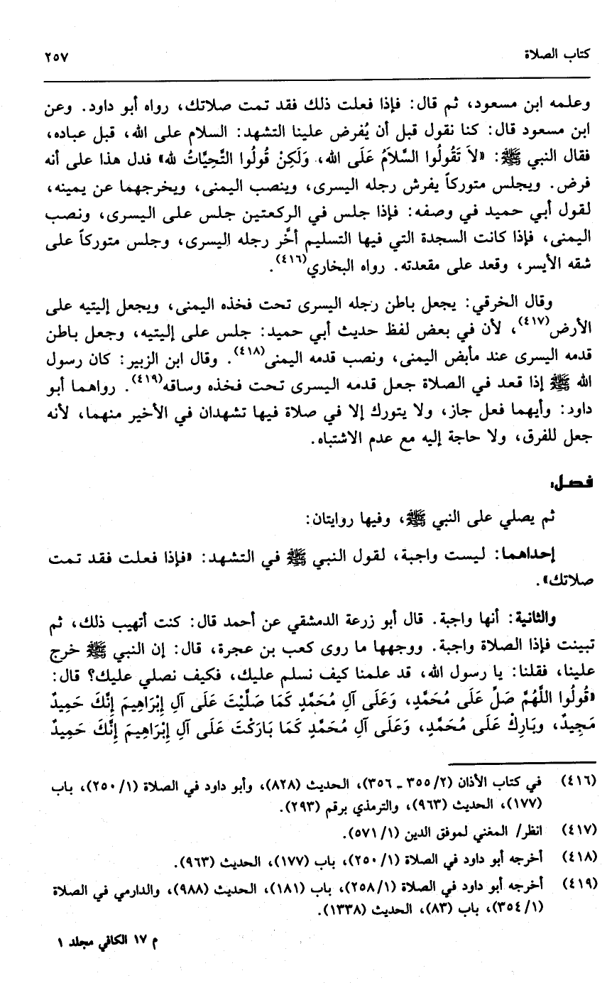 والثانية: أنها واجبة، قال أبو زرعة الدمشقي، عن أحمد قال: كنت أتهيب ذلك، ثم تبينت، فإذا الصلاة واجبة، ووجهها ما روى كعب بن عجرة قال: إن النبي - صَلَّى اللَّهُ عَلَيْهِ وَسَلَّمَ - خرج علينا فقلنا: يا رسول الله، قد علمنا كيف نسلم عليك، فكيف نصلي عليك؟ قال: «قولوا: اللهم صل على محمد، وعلى آل محمد، كما صليت على آل إبراهيم، إنك حميد مجيد، وبارك على محمد، وعلى آل محمد، كما باركت على آل إبراهيم، إنك حميد