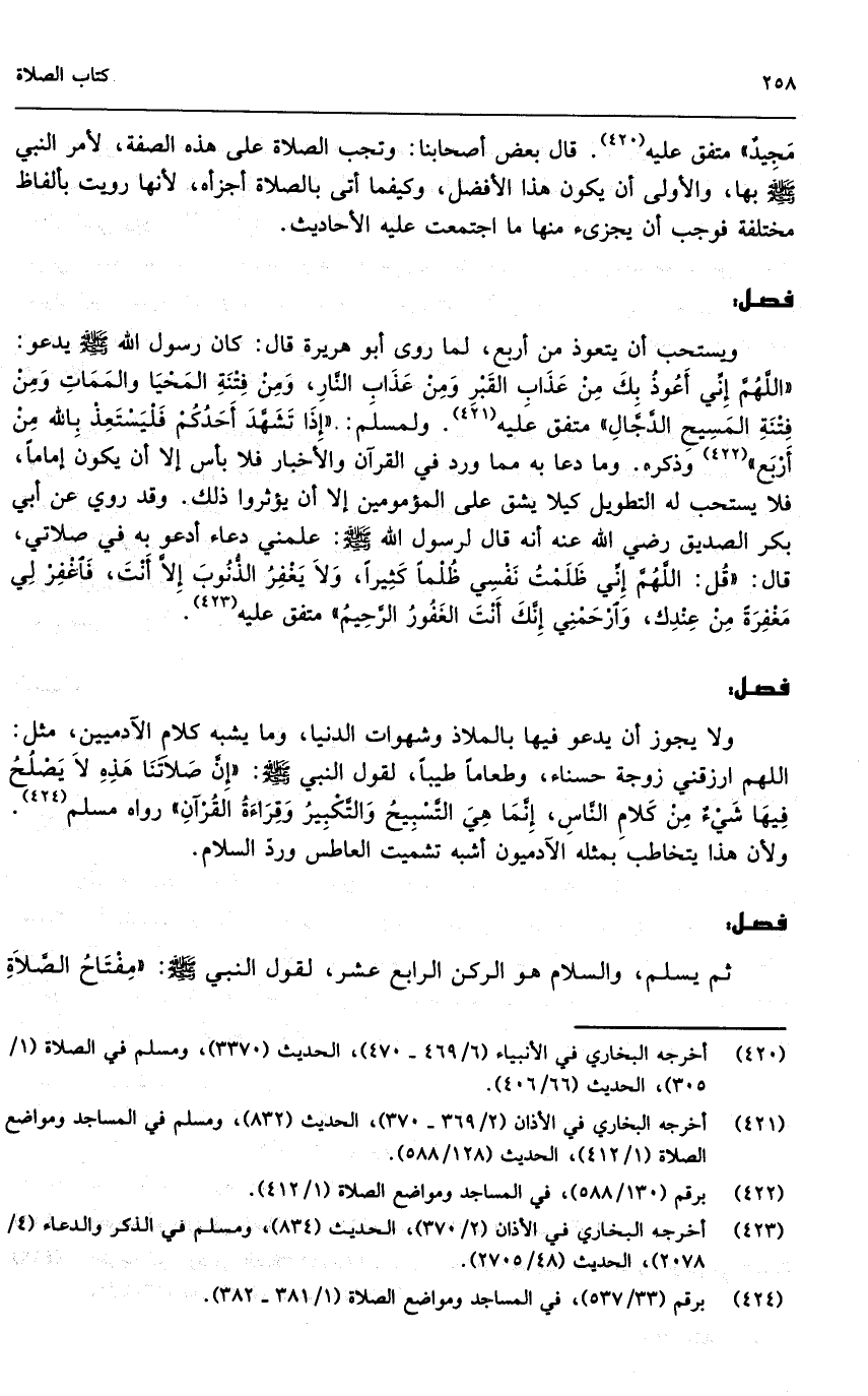 ويستحب أن يتعوذ من أربع؛ لما روى أبو هريرة قال: كان رسول الله - صَلَّى اللَّهُ عَلَيْهِ وَسَلَّمَ - يدعو: «اللهم إني أعوذ بك من عذاب القبر، ومن عذاب النار، ومن فتنة المحيا والممات، ومن فتنة المسيح الدجال» متفق عليه، ولمسلم: «إذا تشهد أحدكم فليستعذ بالله من أربع» وذكره، وما دعا به مما ورد في القرآن والأخبار فلا بأس إلا أن يكون إمامًا، فلا يستحب له التطويل، كيلا يشق على المأمومين إلا أن يؤثروا ذلك، وقد روي عن أبي بكر الصديق - رَضِيَ اللَّهُ عَنْهُ - أنه قال لرسول الله - صَلَّى اللَّهُ عَلَيْهِ وَسَلَّمَ -: علمني دعاء أدعو به في صلاتي، قال: «قل: اللهم إني ظلمت نفسي ظلمًا كثيرًا، ولا يغفر الذنوب إلا أنت، فاغفر لي مغفرة من عندك، وارحمني إنك أنت الغفور الرحيم» متفق عليه.