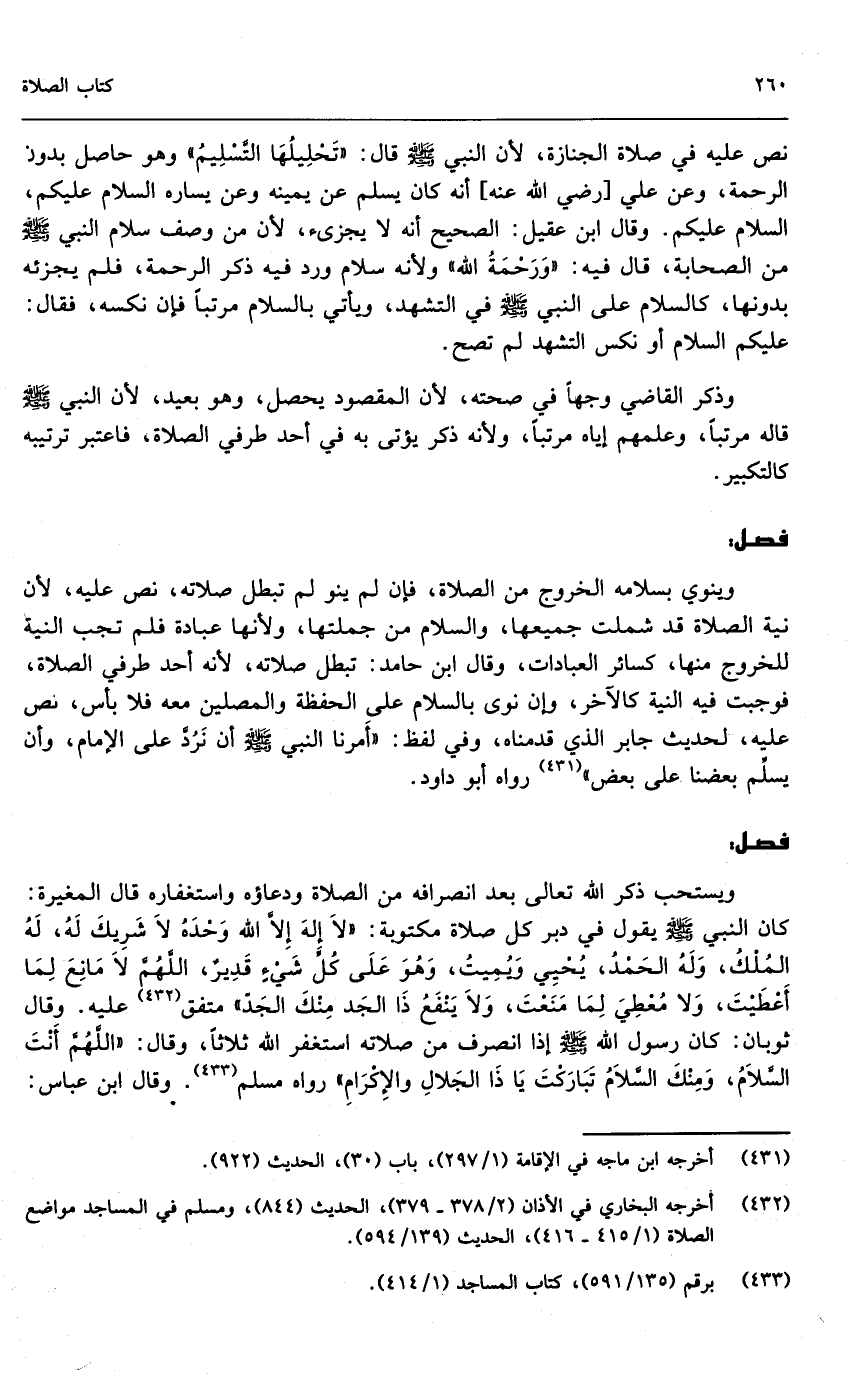 وينوي بسلامه الخروج من الصلاة، فإن لم ينو لم تبطل صلاته، نص عليه؛ لأن نية الصلاة قد شملت جميعها، والسلام من جملتها، ولأنها عبادة فلم تجب النية للخروج منها كسائر العبادات، وقال ابن حامد: تبطل صلاته؛ لأنه أحد طرفي الصلاة، فوجبت فيه النية كالآخر، وإن نوى بالسلام على الحفظة وعلى المصلين معه فلا بأس، نص عليه؛ لحديث جابر الذي قدمناه، وفي لفظ: «أمرنا النبي - صَلَّى اللَّهُ عَلَيْهِ وَسَلَّمَ - أن نرد على الإمام، وأن يسلم بعضنا على بعض» رواه أبو داود.