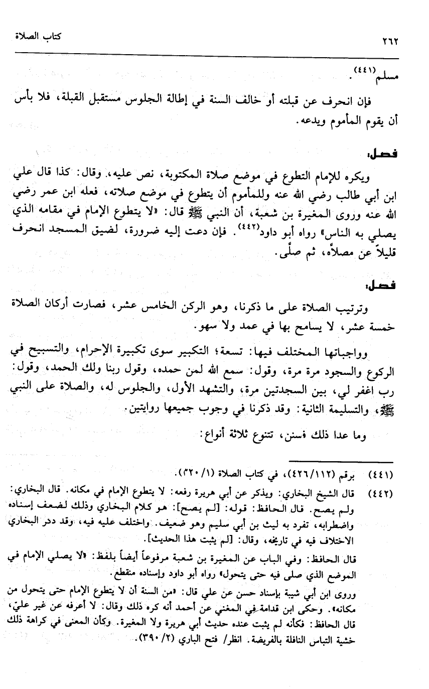 ويكره للإمام التطوع في موضع صلاة مكتوبة، نص عليه، وقال: كذا قال علي بن أبي طالب - رَضِيَ اللَّهُ عَنْهُ - وللمأموم أن يتطوع في موضع صلاته، فعله ابن عمر - رَضِيَ اللَّهُ عَنْهُ -، وروى المغيرة بن شعبة: أن النبي - صَلَّى اللَّهُ عَلَيْهِ وَسَلَّمَ - قال: «لا يتطوع الإمام في مقامه الذي يصلي به الناس» رواه أبو داود. فإن دعت إليه ضرورة، لضيق المسجد انحرف قليلًا عن مصلاه، ثم صلى.