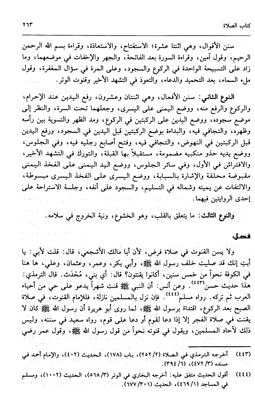 ولا يسن القنوت في صلاة فرض؛ لأن أبا مالك الأشجعي، قال: قلت لأبي: «يا أبت، إنك قد صليت خلف رسول الله - صَلَّى اللَّهُ عَلَيْهِ وَسَلَّمَ -، وأبي بكر، وعمر، وعثمان، وعلي، هاهنا في الكوفة نحوًا من خمس سنين، أكانوا يقنتون؟ قال: أي بني، محدث» ، قال الترمذي: هذا حديث حسن. وعن أنس: «أن النبي - صَلَّى اللَّهُ عَلَيْهِ وَسَلَّمَ - قنت شهرًا يدعو على حي من أحياء العرب، ثم تركه» . رواه مسلم، فإن نزل بالمسلمين نازلة فللإمام القنوت في صلاة الصبح بعد الركوع، اقتداء برسول الله - صَلَّى اللَّهُ عَلَيْهِ وَسَلَّمَ -، لما روى أبو هريرة «أن رسول الله - صَلَّى اللَّهُ عَلَيْهِ وَسَلَّمَ - كان لا يقنت في صلاة الفجر إلا إذا دعا لقوم أو دعا على قوم» ، رواه سعيد في سننه، وليس ذلك لآحاد المسلمين، ويقول في قنوته نحوًا من قول رسول الله - صَلَّى اللَّهُ عَلَيْهِ وَسَلَّمَ -، وقول عمر رضي
